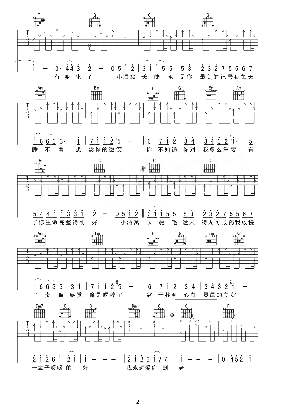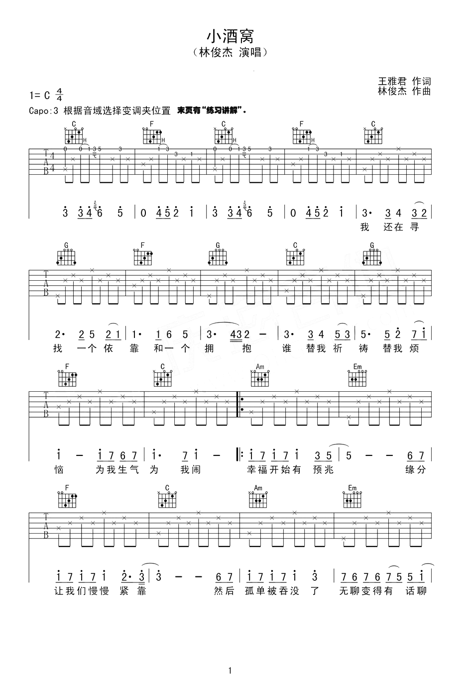 曲谱介绍: 《小酒窝》是林俊杰、蔡卓妍合唱的一首歌曲。由林俊杰作曲、王雅君作词,收录于林俊杰2008年发行的专辑《JJ陆》中,是电视剧《爱情睡醒了》的插曲。2009年这首歌曲获得了十大劲歌金曲最受欢迎华语歌曲奖、十大中文金曲奖全国最佳中文歌曲奖、百度娱乐沸点最热门十大金曲等奖项。 《小酒窝》描写的是林俊杰的爱情观,林俊杰在广州参加某节目时表示自己认识一位长睫毛、小酒窝的圈中人。当林俊杰与那位圈中人处于互有好感的暧昧阶段时,由于担心对方公司的反对,因而林俊杰不敢说出实情,只能通过创作歌曲《小酒窝》来表白自己的感情。《小酒窝》最初由林俊杰独唱,但他在创作时发觉一个人唱有些孤独,如果加进一点女生的声音或许会更好,最后林俊杰选定由蔡卓妍来和自己合唱这首歌曲。 《小酒窝》是一首并不难唱的轻快歌曲,表达了恋人之间恬淡的情愫与倾诉。作为一首值得称道的对唱歌曲,《小酒窝》具备了一切流行的元素,旋律上口适宜在KTV里传唱,受众面广,无论情侣还是普通朋友,唱起来都别有一番味道。歌曲所写的题材也喜闻乐见,小酒窝、长睫毛既符合歌手本身的形象,也令一大批歌迷轻易地对号入座。