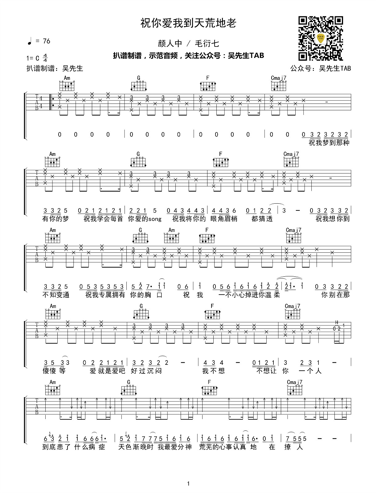 祝你爱我到天荒地老吉他谱 - 颜人中 - 吉他独奏谱