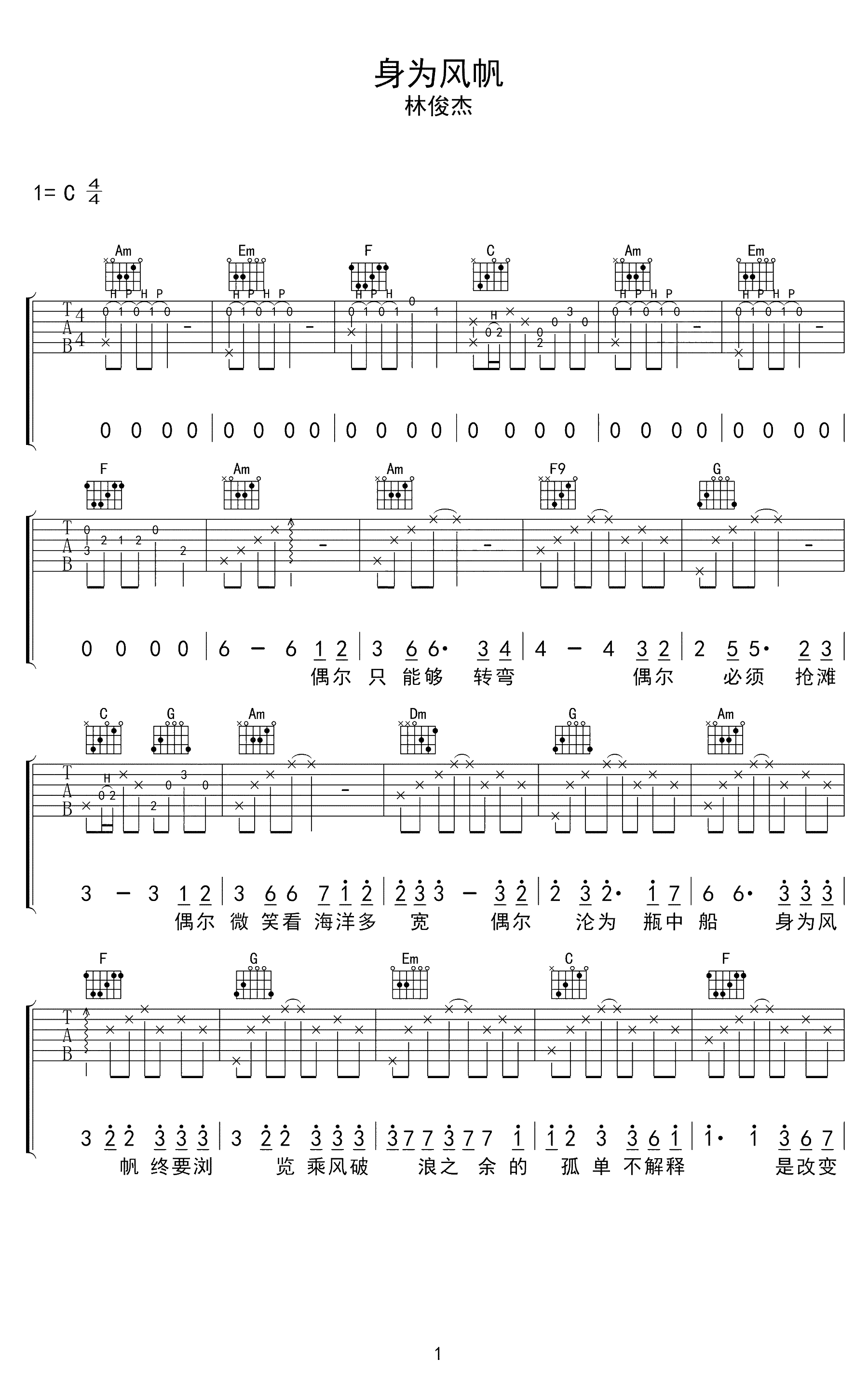身为风帆吉他谱 - 林俊杰 - C调吉他独奏谱