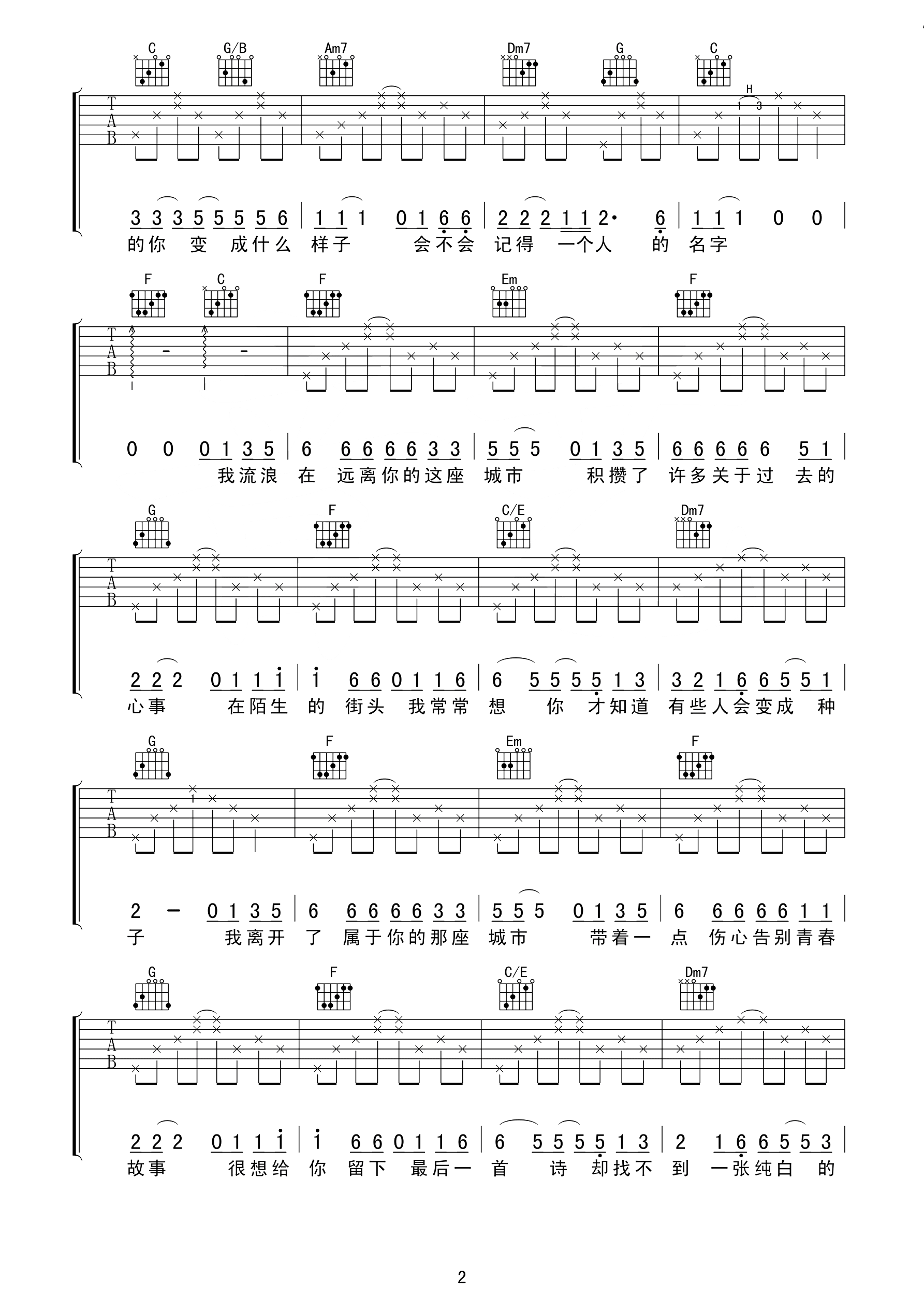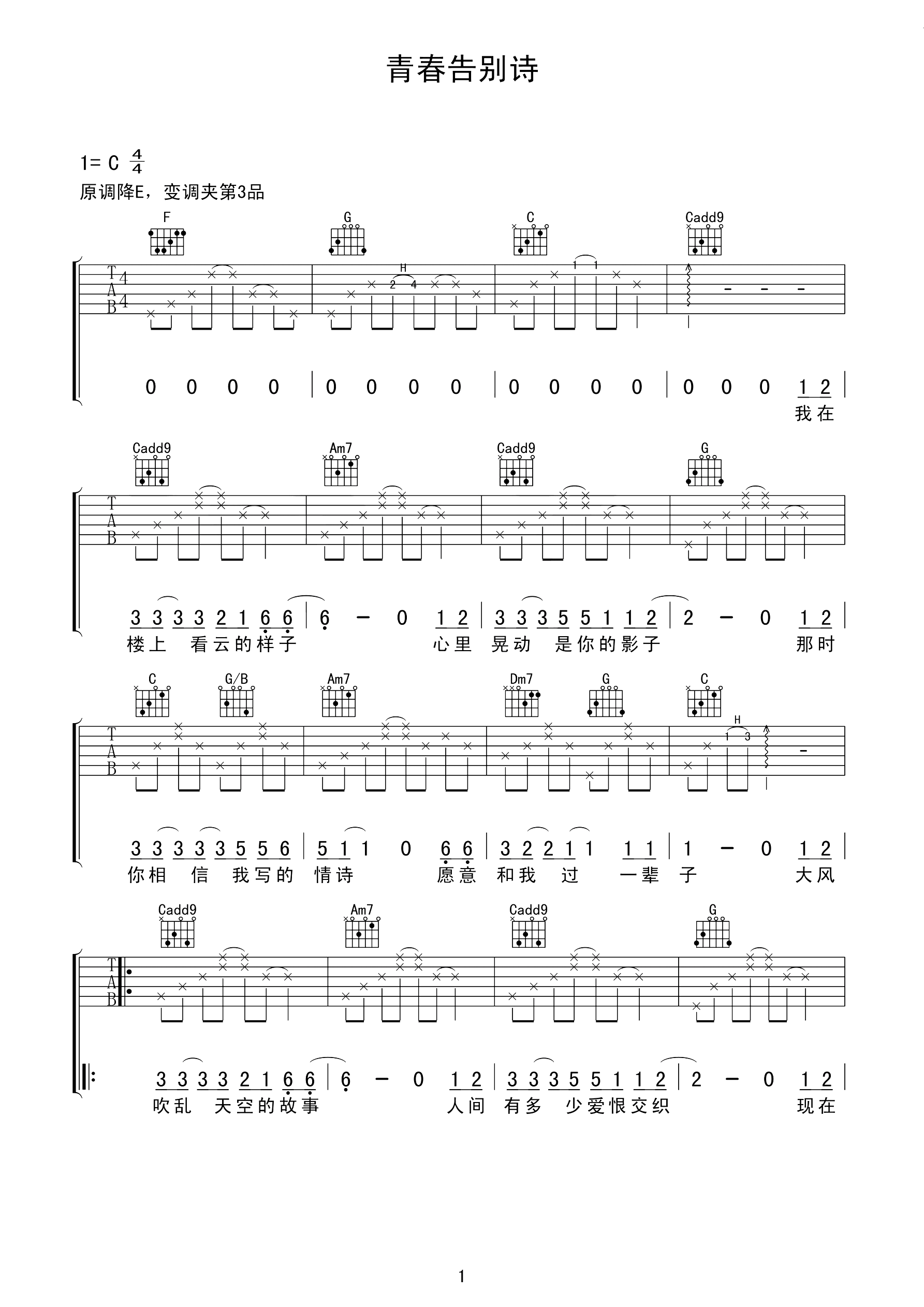 曲谱介绍:   于和伟倾情献唱《下一站,别离》插曲——《青春告别诗》,一把吉他在手,于和伟首度在荧幕前边弹边唱,为《下一站,别离》献上这首充满青春气息、追忆往昔故事的歌曲。回忆青春,告别青春故事,于和伟将这首带有回忆感的青春歌曲演唱的深情动人。   《下一站,别离》由于和伟、李小冉领衔主演,讲述了对爱情心灰意冷的秋阳、盛夏两人怦然心动却懵懂不知,以契约形式开始了一段有名无实的婚姻,最终重新领悟人生与爱情真谛的故事。   歌词中“我离开了属于你的那座城市,带着一点伤心告别青春故事,很想给你留下最后一首诗,却找不到一张纯白的纸”灰色却不失美好的将过去封存在回忆里,仿佛现实中的我和你,告别曾经的青春,对回忆挥手但不说再见。   该剧中对爱情心灰意冷的秋阳和盛夏,从相遇到相识,从相互嫌弃到彼此中的默契,期间二人虽有怦然心动但却懵懂不知,用契约的形式进行着有名无实的婚姻,也是因为互相的理解和成长,最后收获的最真挚的爱情。
