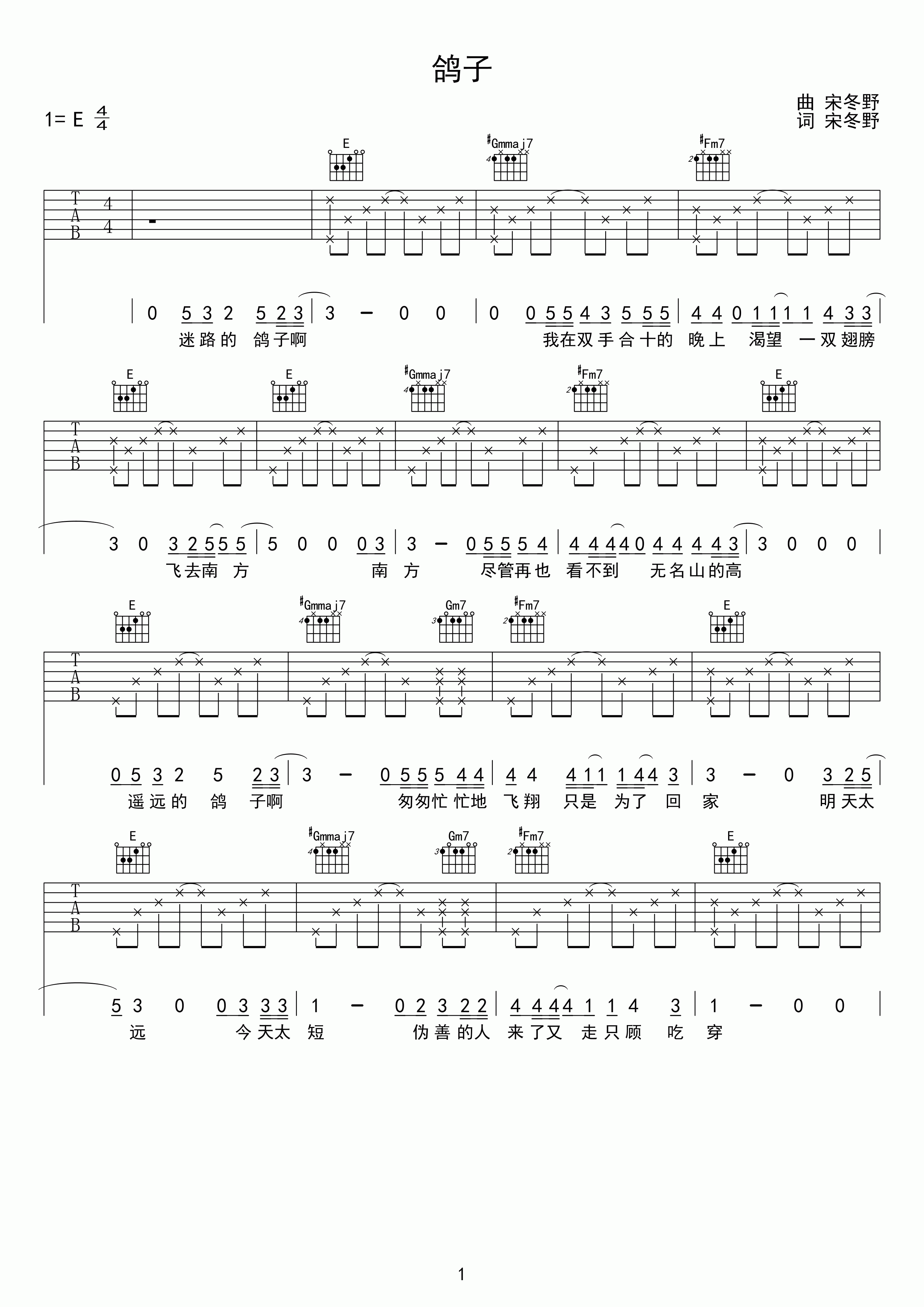 曲谱介绍:   《鸽子》是老宋写给自己在1993年2月2日失去的一只鸽子的,那一日,父亲瞒着他将养的鸽子摔在地上,熬了一锅汤招待客人,很多年后他将它写进了歌里。   去年我在偶然间读到刘若英的文字,她在自己的乐评《从宋冬野的歌中,听到…》里写到:“你应该也有这种体验,在某一段时间里,总是重复听着同一首歌,忘记听了几遍,听到觉得自己像消失了,钻进那歌里去了,那一阵子,我的主题曲是宋冬野的《鸽子》。”   一个是流行圈炙手可热的奶茶,一个是民谣圈的宋胖子,我很乐见自己的两位偶像能有一丝关联,且带给我很多共鸣,这也是我唯一一次感受到他们离我如此之近。   是的,宋冬野烟熏低音炮的声线自带三分忧伤,他的每一首歌都在低沉婉转地讲述一些我未曾体验过的经历,那种被我称作孤独与渴望的情绪,在《鸽子》里的感受最强烈。