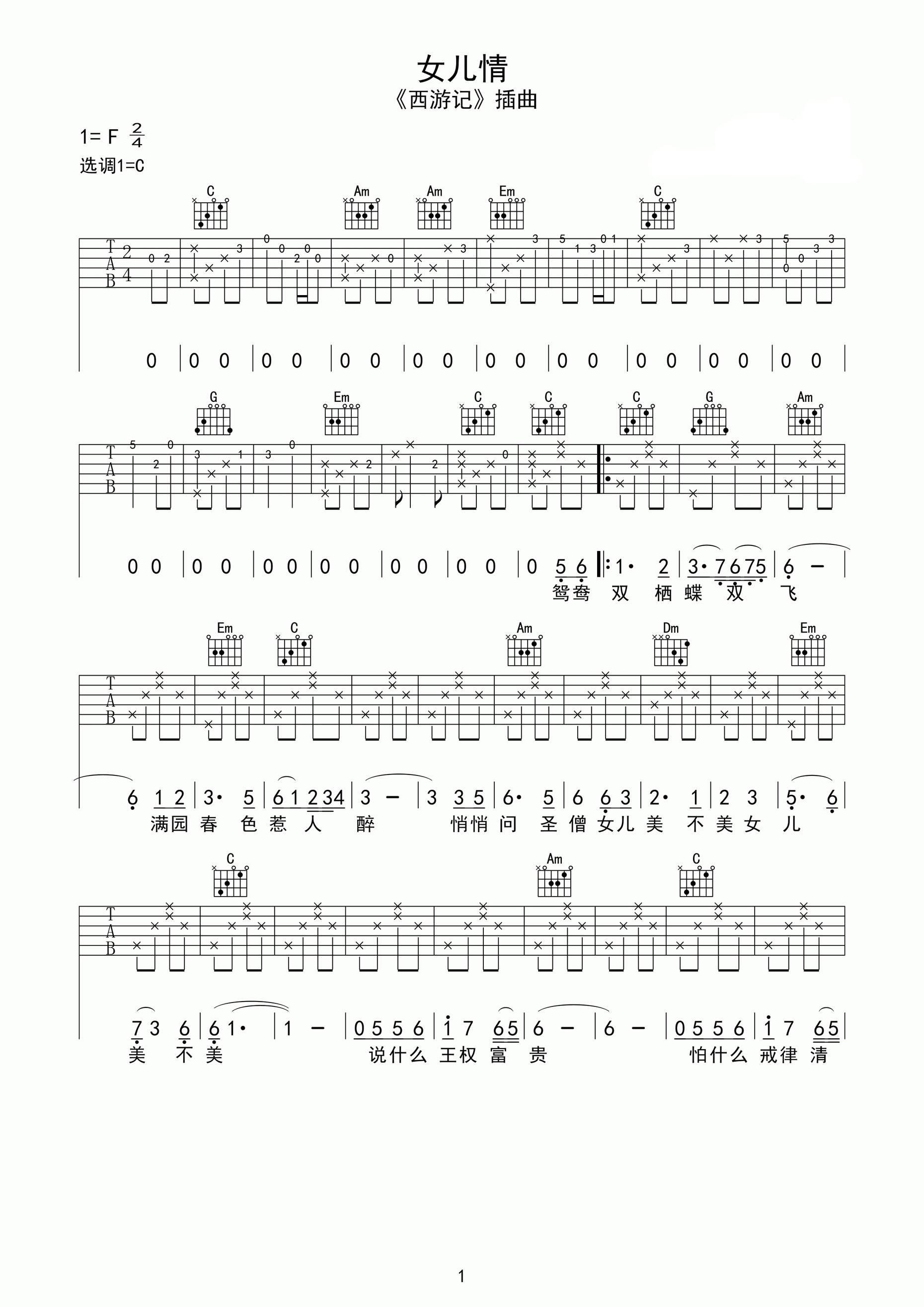 曲谱介绍:   韩寒导演的电影《后会无期》中,有这样一幕难忘的场景,不知道你是否记得?当男主人公马浩汉与刘莹莹道别之后,忽然响起万晓利翻唱的《西游记》插曲——《女儿情》。背景音乐和人物画面的相互演绎,成为整部电影最亮眼的镜头之一。   林俊杰在浙江卫视某节目演唱《女儿情》,这首歌后来又被林俊杰、冯绍峰和李玉刚等多位明星翻唱,红遍大江南北。歌曲的背后,唐僧与女儿国国王的“情缘”又被人们重新拾起,有了各种各样的解读。