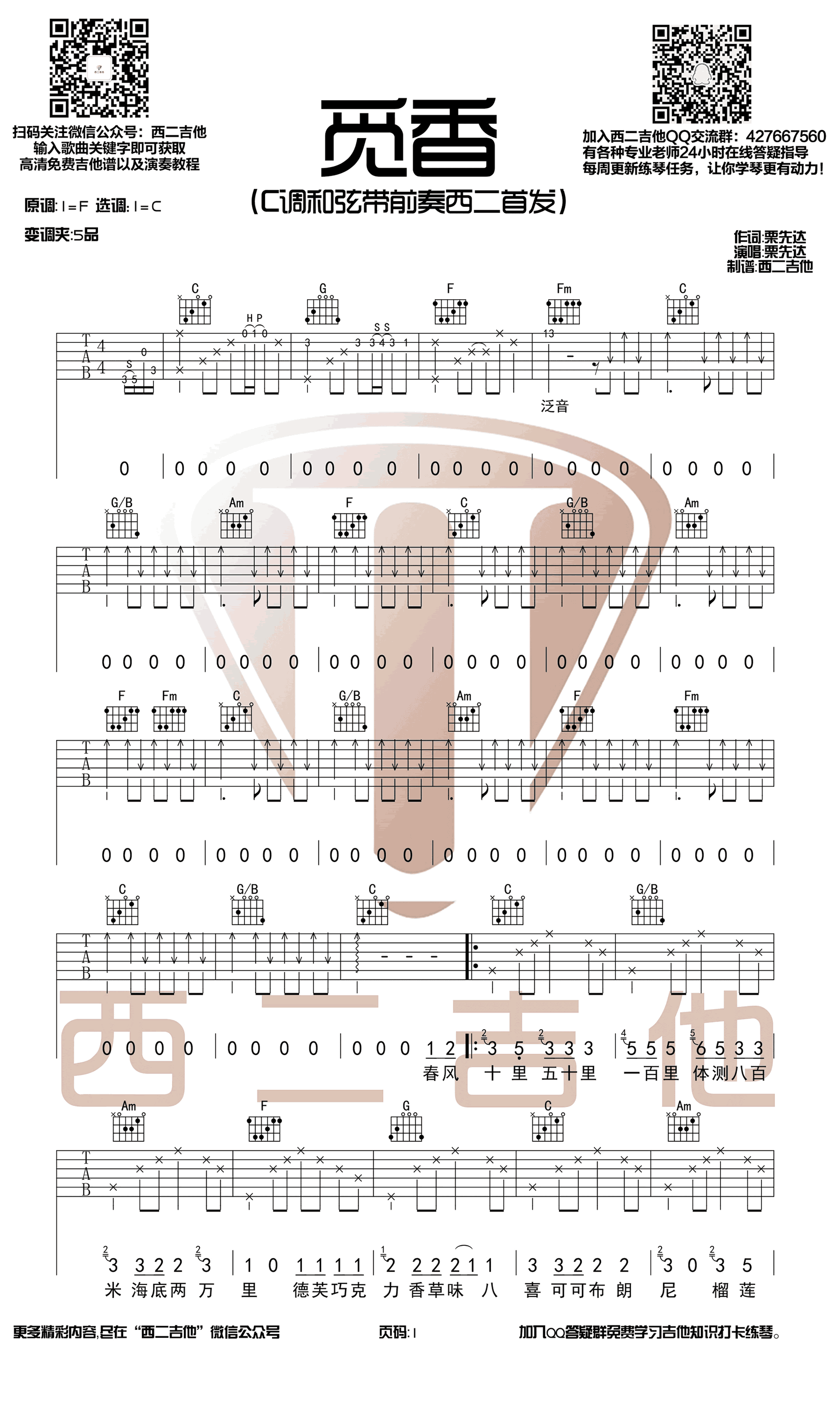曲谱介绍: 栗先达《觅香》吉他谱,C调和弦指法带前奏,变调夹夹五品,觅香六线谱,四张高清图片谱,感谢西二吉他编配出品,91吉他谱网站上传分享。 穿越山河万里不如你,踏尽春夏秋冬不如你,什么什么都不如你。栗先达一首暖心歌曲,轻轻的吟唱,淡淡的思念。因为你的存在,才觉得生活可以这样温暖。