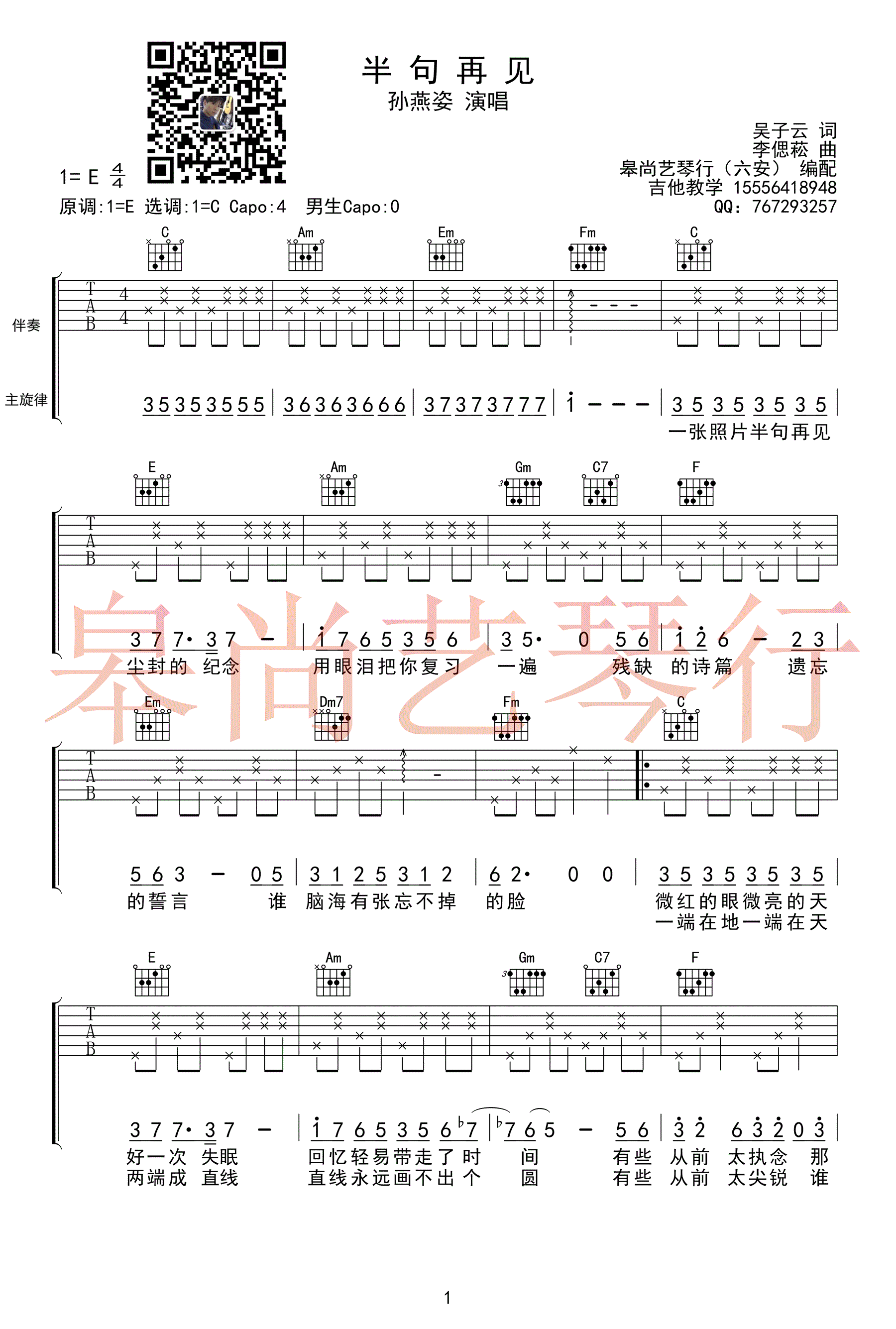 曲谱介绍: 孙燕姿《半句再见》吉他谱,电影《六弄咖啡馆》主题曲,原调E,选调C,CAPO第四品,男生不用变调夹,半句再见吉他弹唱谱,高清图片六线谱,皋尚艺琴行编配出品,91吉他谱网站上传。 孙燕姿一首疗愈情歌,歌声里百转千折的思绪,表达出对青春过往遗憾的告别,给我们说再见的勇气,等待某天,挥手过眼云烟的感伤,和自己的心和解。