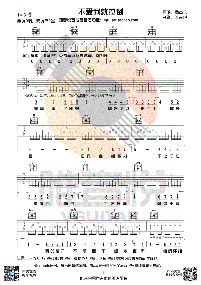 曲谱介绍: 不爱我就拉倒吉他谱,C调指法六线谱,变调夹夹二品。周杰伦的变化实在太快了,前两个月还在等你下课,现在不爱就拉倒了。曲谱为吉他弹唱谱完整版,三张图片谱例,感谢唯音悦出品,91吉他谱网站上传。 编配演奏说明:主歌和过门分解都可以改成扫弦,和副歌扫弦节奏型一样的就行。用了一些转位和弦,指法安排可以多用大拇指反扣这一个技巧!Rap部分和结尾部分和弦结构与副歌还是有点不一样,琴友们稍微注意一下哈~