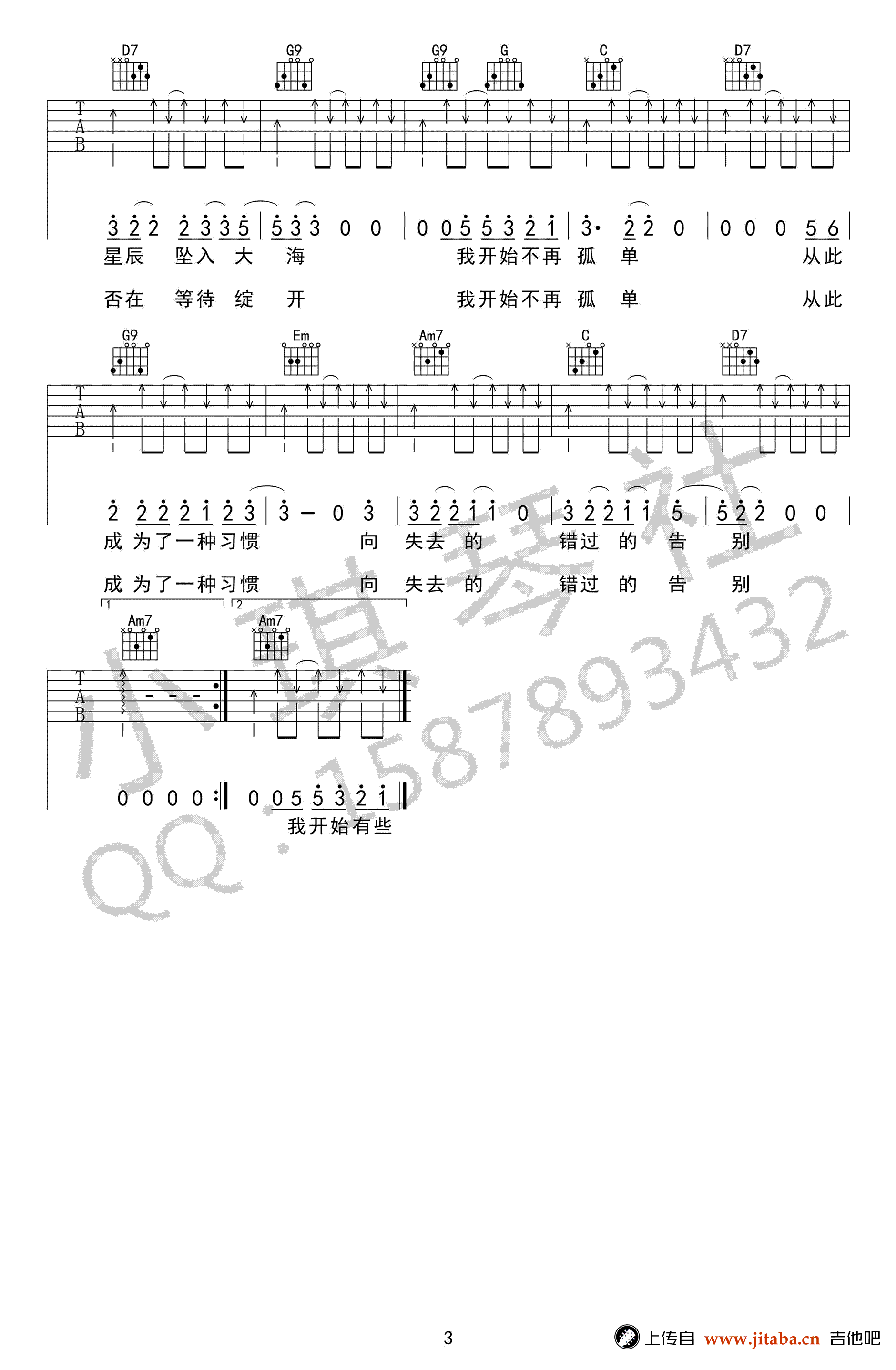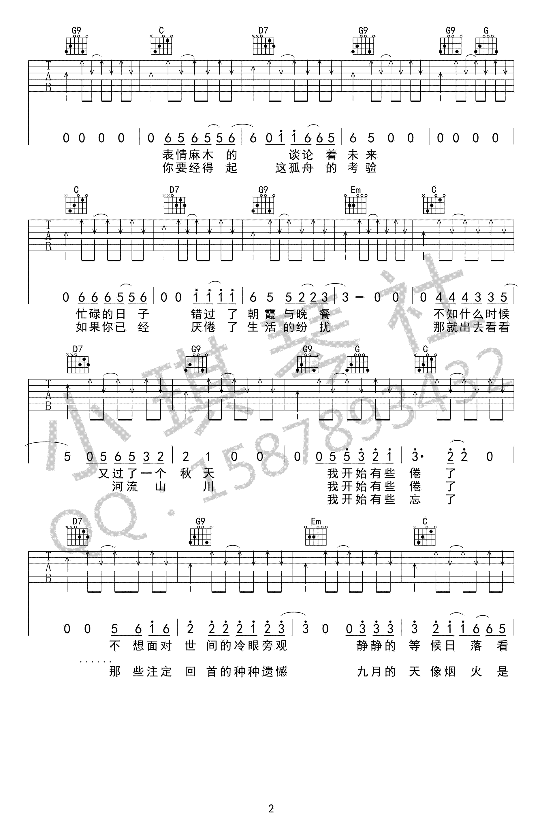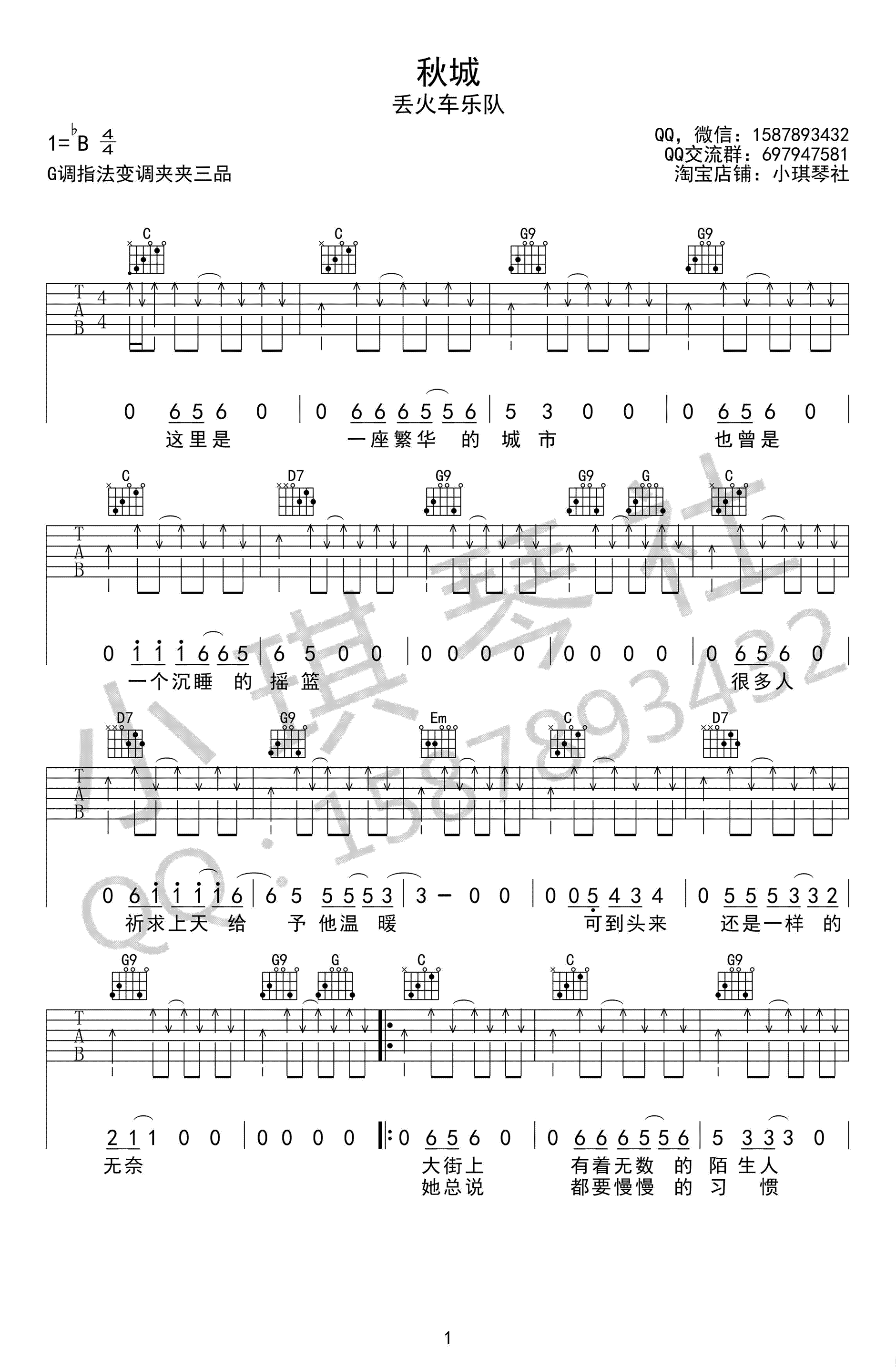 曲谱介绍: 丢火车乐队《秋城》吉他谱,原调bB调,G调指法变调夹夹三品,秋城六线谱,吉他弹唱图片谱,小琪琴社编配出品,91吉他谱网站上传。