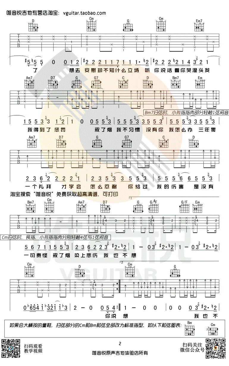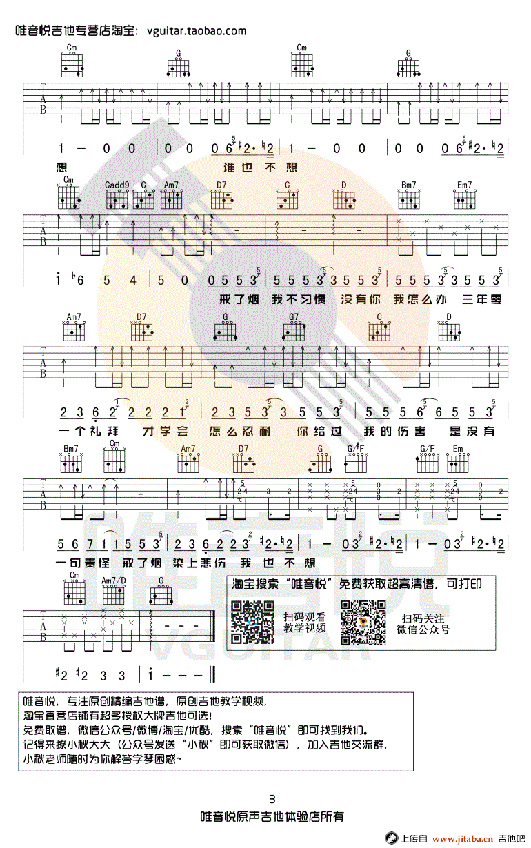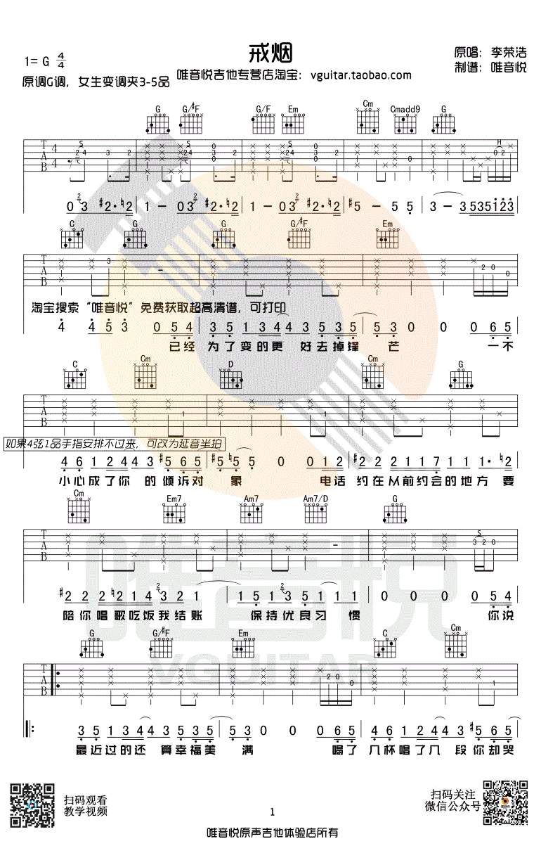曲谱介绍: 李荣浩《戒烟》吉他谱,G调指法编配,原版简单优化吉他谱,戒烟六线谱,女生变调夹3-5品,三张图片谱例,感谢唯音悦出品,91吉他谱网站上传分享。 演奏提示:李荣浩的歌曲用的和弦变化也是比较多的,所以大家可以看看谱好好体会一下。不过会有一些小难度在里面,然后副歌扫弦位置Bm和Cm和弦需要用到一些小技巧来闷音,主要是用食指与小拇指指肉部分轻触4弦与1弦即可,最后大家如果会大横按,建议使用Bm和Cm的标准指型,还有注意看谱子的标记哦。