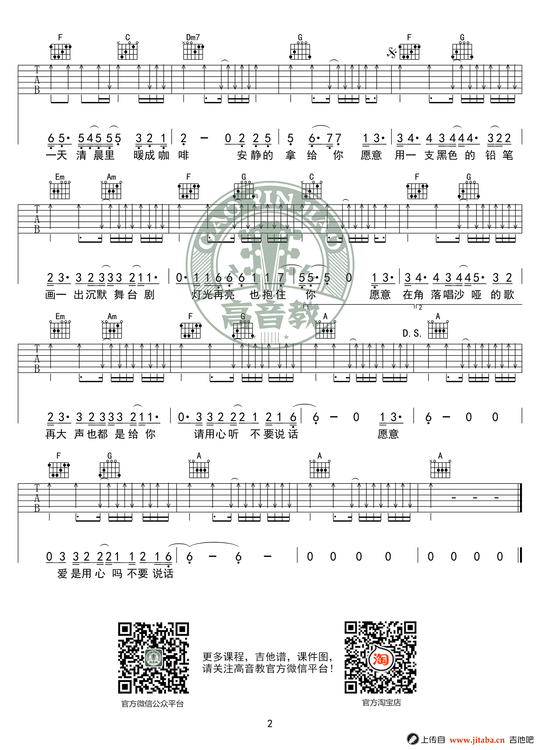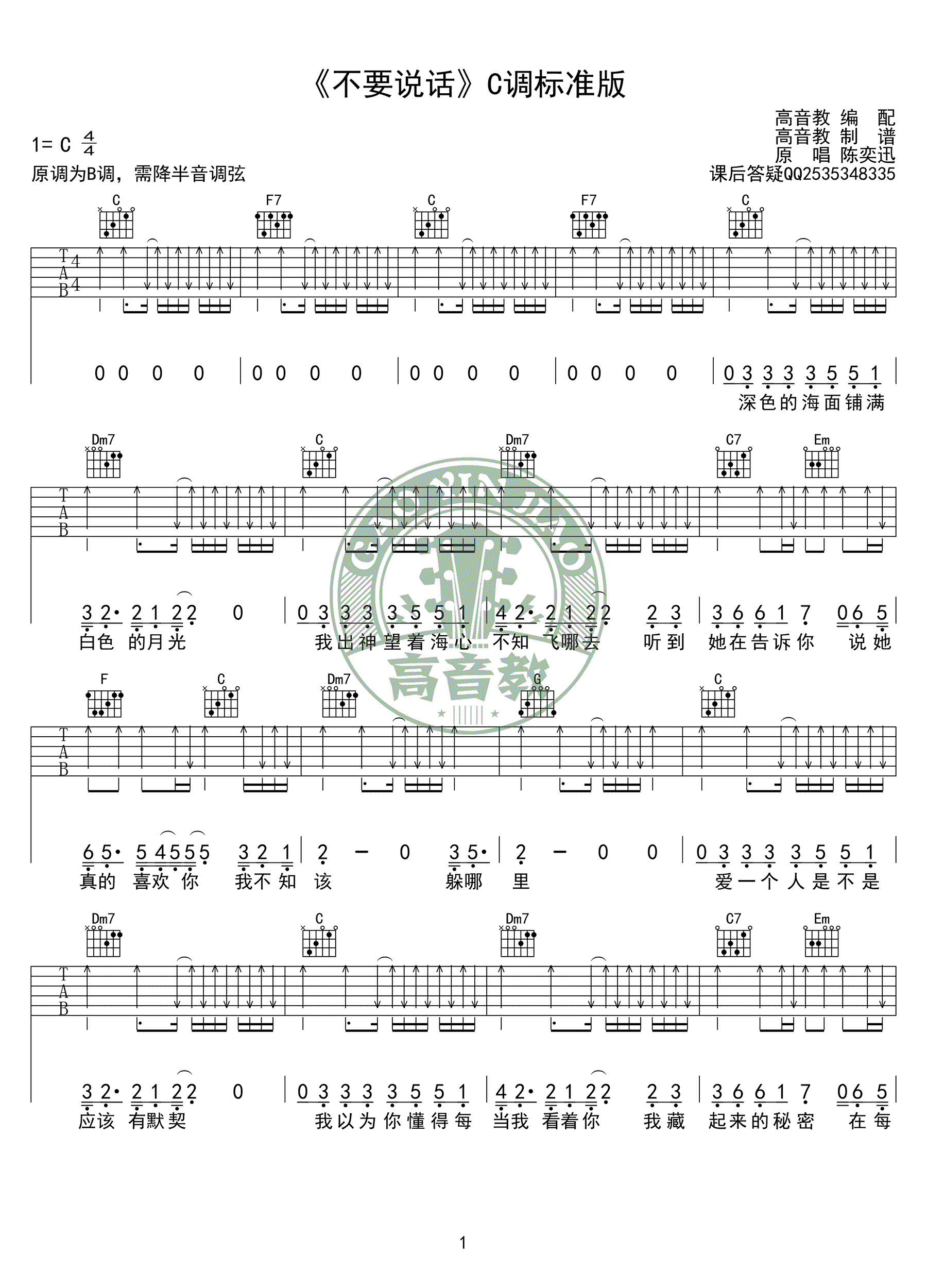 曲谱介绍: 陈奕迅《不要说话》吉他谱,C调标准版,原调为B调,需降半音调弦,不要说话六线谱,高清图片谱,感谢高音教编配出品,91吉他谱网站上传。随谱附上歌曲的配套吉他弹唱教学视频,琴友们跟随猴哥老师的讲解练习。爱是用心的,心和心的交流就可以感知对方的情绪,很多时候并不需要用语言,只需要一个吻甚至一个拥抱就够了。请用心听,不要说话。