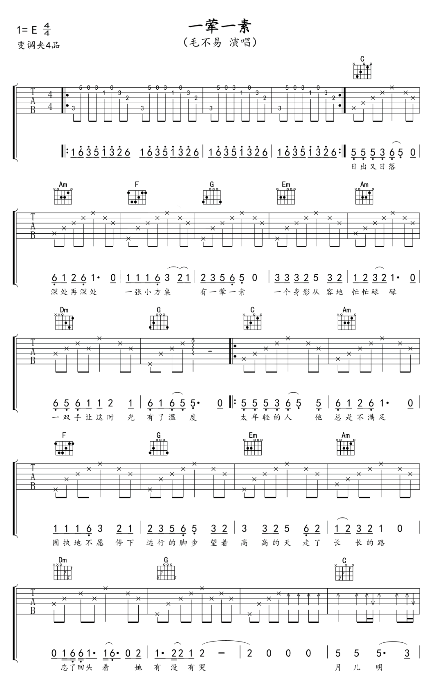 曲谱介绍: 毛不易《一荤一素》吉他谱,原调E,变调夹夹四品,选用C调指法编配,一荤一素六线谱,毛不打谱啦给母亲的歌,歌词有故事有温度,低沉的歌声无声无息地唱进人的灵魂,让人们驱赶孤独,抚平伤痛,然后继续前行。