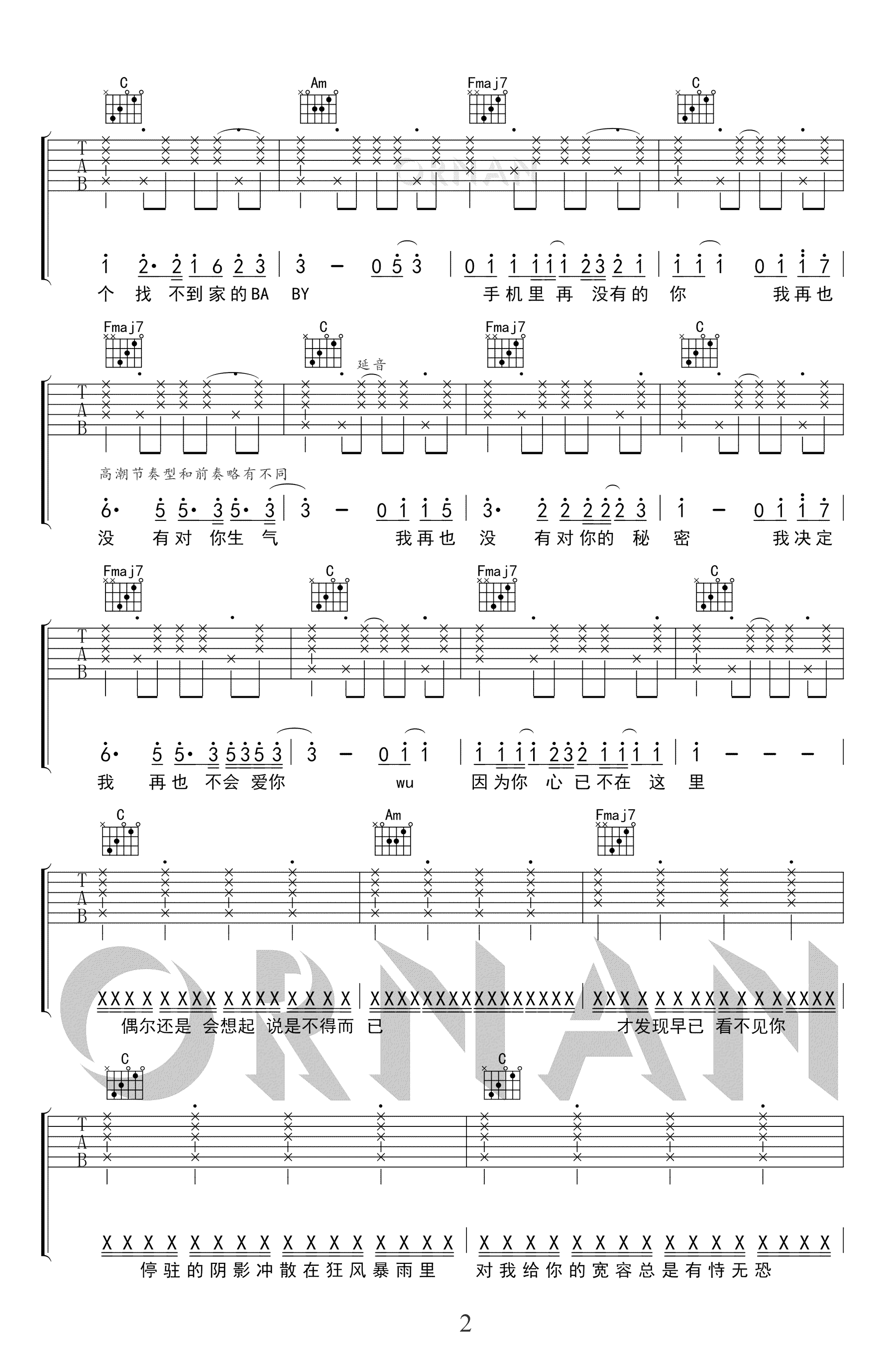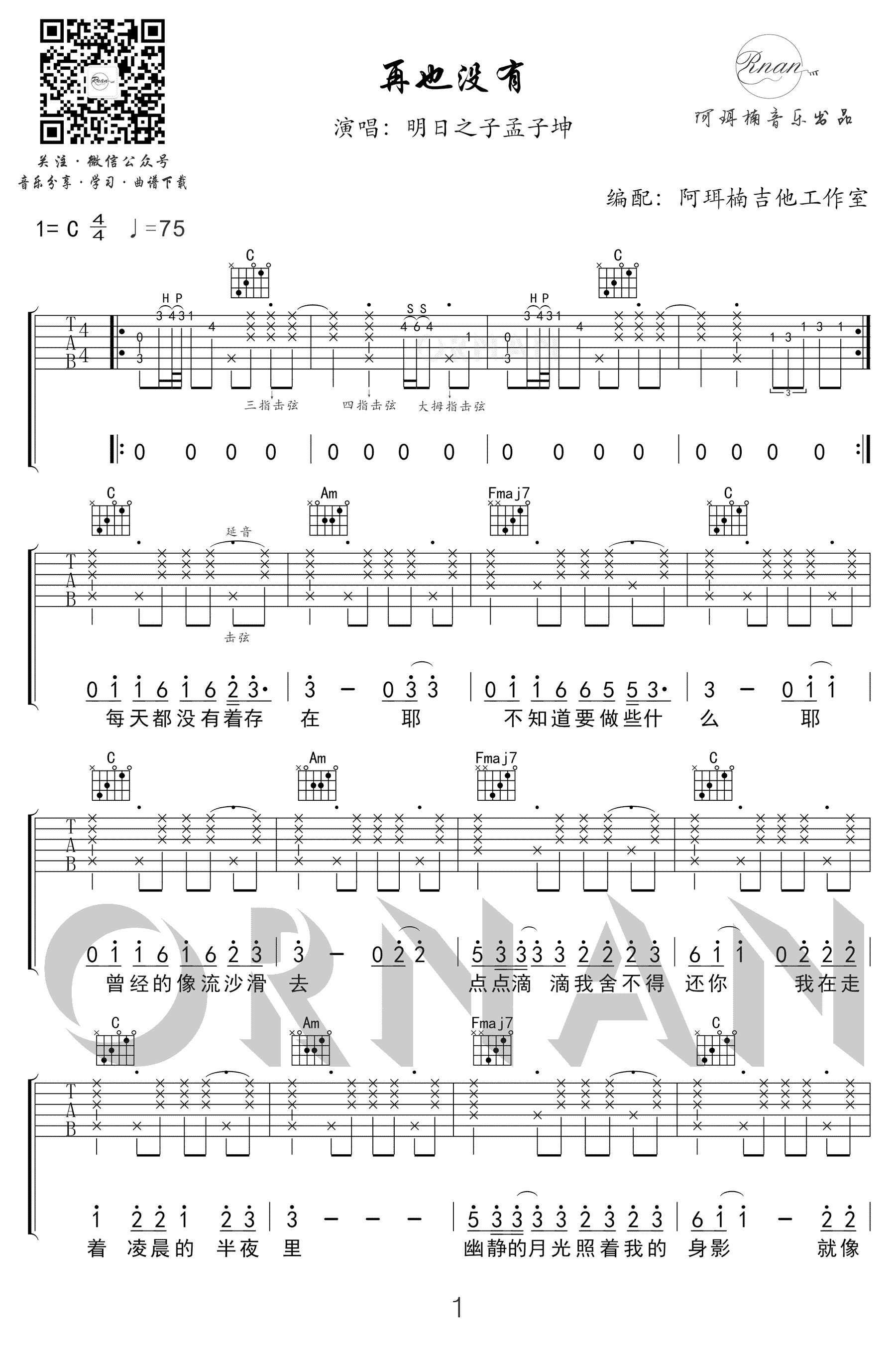 曲谱介绍: 再也没有吉他谱,明日之子孟子坤演唱,C调指法精编版本,演奏说明琴友们参照图片谱标注说明。再也没有六线谱,三张高清弹唱谱,阿珥楠吉他工作室出品,91吉他谱网站上传。 Ryan.B创作的一首慢板情歌,杨佬叁和Ryan.B的合作《再也没有》,听一遍就觉得很触动心灵深处。汪峰在《歌手》节目也改编演绎了这首虐心歌曲广受好评。