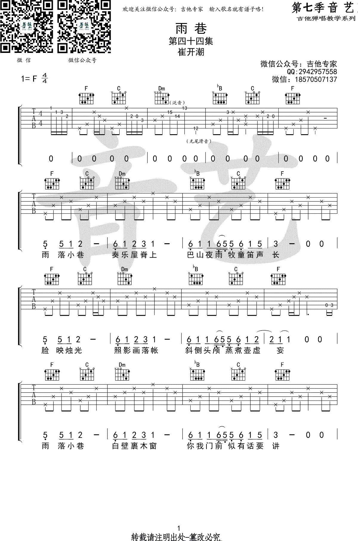 雨巷吉他谱 - 崔开潮 - F调吉他弹唱谱