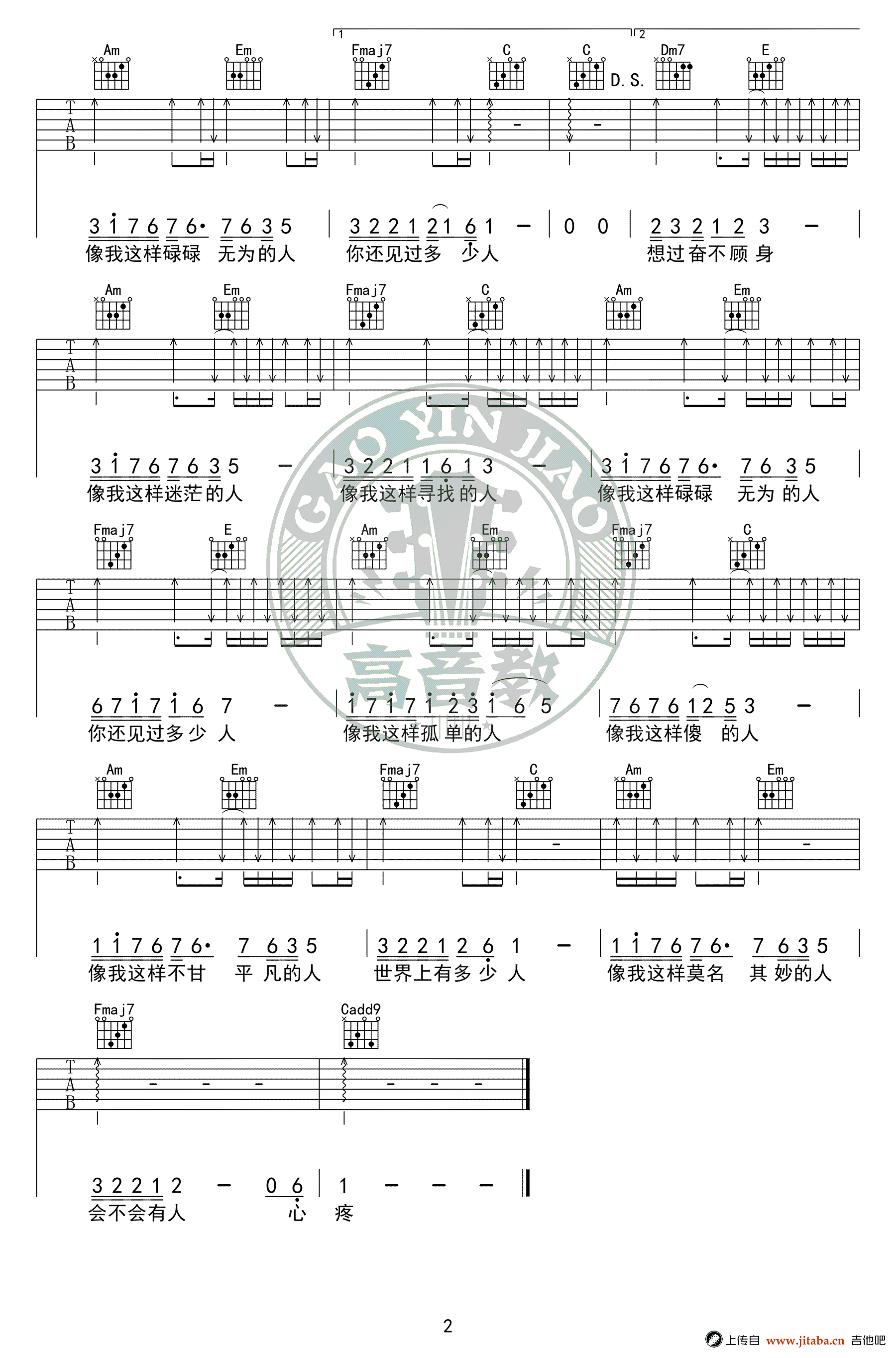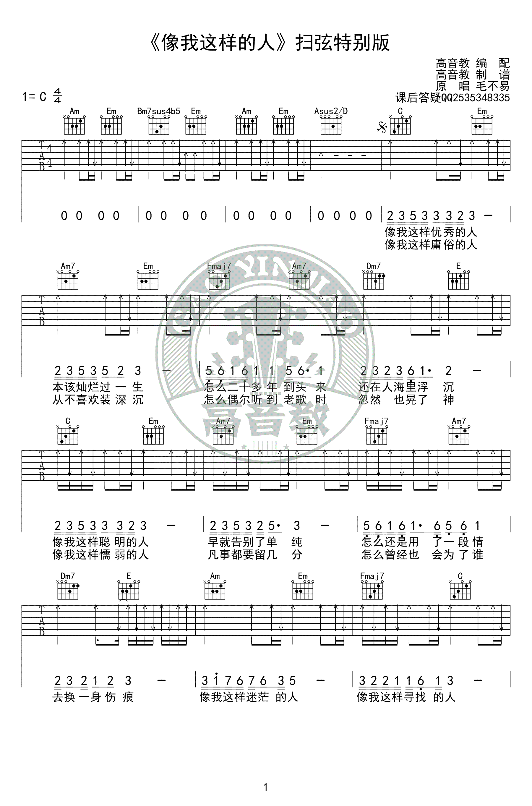曲谱介绍: 像我这样的人吉他谱,毛不易代表作品,C调弹唱谱,扫弦特别版,像我这样的人吉他六线谱,高清图片谱,感谢高音教编配出品,91吉他谱网站上传。 一字一句都是孤独,唱进了每一个不甘平凡又还是过得庸庸碌碌的人的心里,让每个听歌的人或多或少都在歌声里看到了自己的影子。