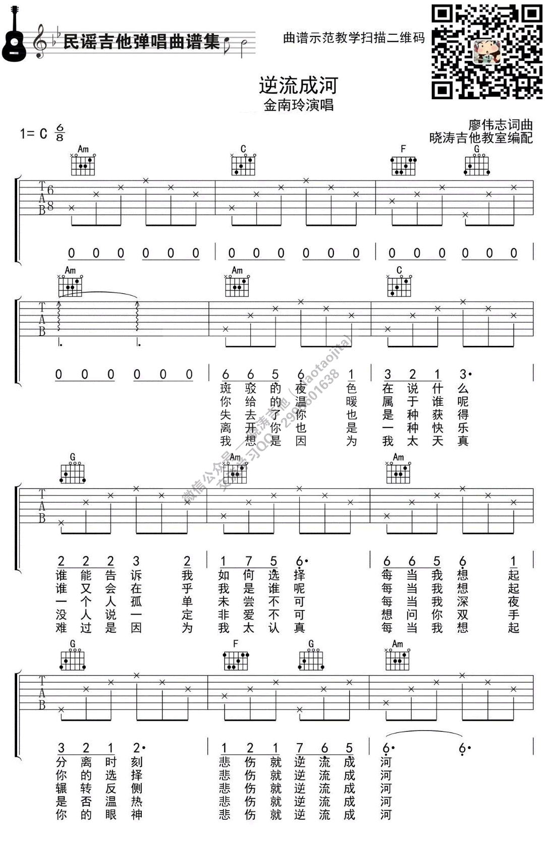 曲谱介绍: 金南玲《逆流成河》吉他谱,C调指法带指弹间奏,一首热门网络歌曲,逆流成河六线谱,歌曲弹与唱配合很简单,晓涛吉他教室编配出品,91吉他谱网站上传。随谱附上《逆流成河》吉他弹唱示范+教学视频,琴友们参照老师的讲解练习。