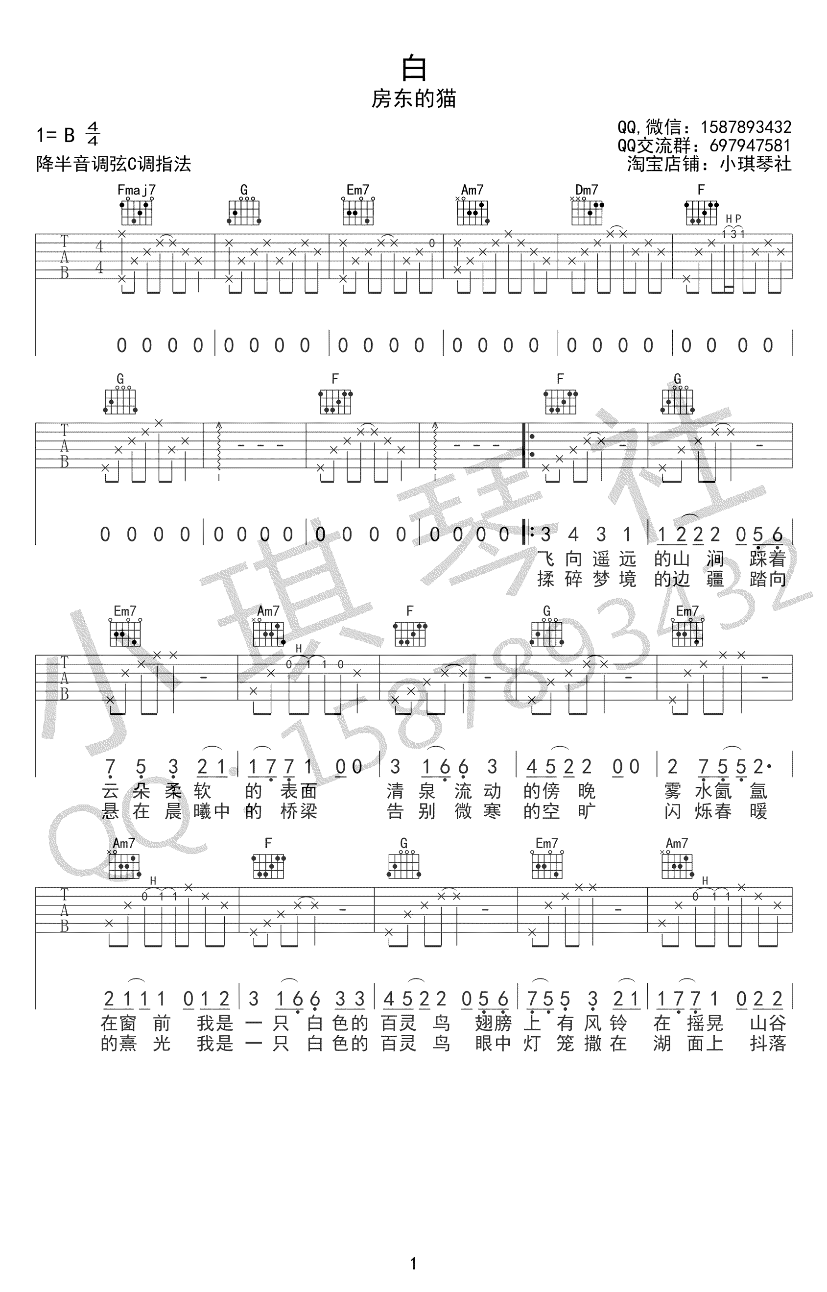 曲谱介绍: 房东的猫《白》吉他谱,原调B,降半音调弦,选用C调指法,《白》吉他六线谱,高清弹唱图片谱,小琪琴社编配出品,91吉他谱网站上传收藏。 房东的猫的新专辑《柔软》中的一首好听的歌曲,歌名叫《白》, “白”的读音和“拜”是一样的,是告别过去, 迎接新的生活的寓意,在纯白的天地,我们可以画出自己想要的样子。