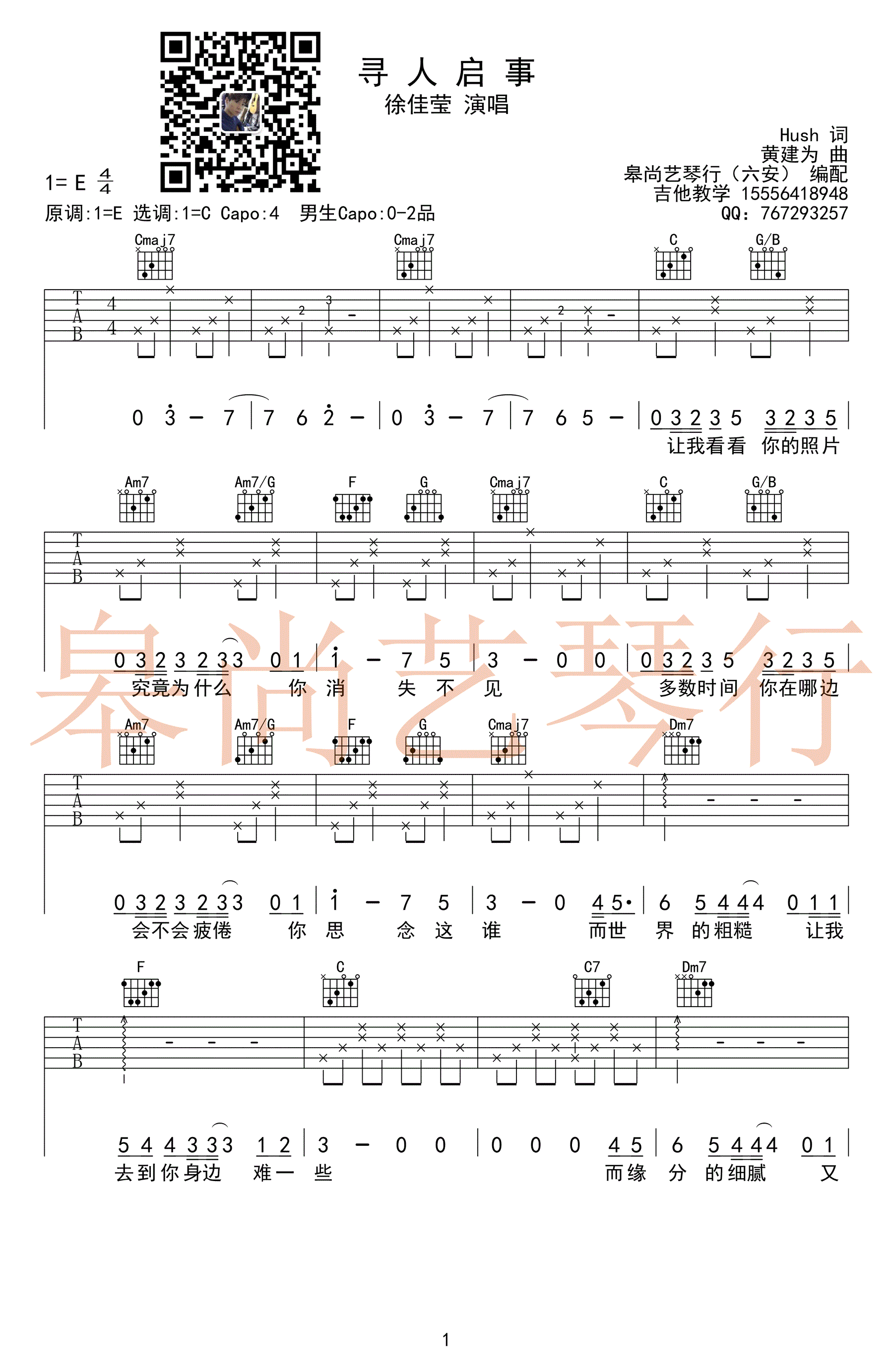 曲谱介绍: 徐佳莹《寻人启事》吉他谱,原调E,选调C,Capo四品,男生弹唱建议0-2品,寻人启事六线谱,三张图片谱高清版,感谢皋尚艺琴行编配,91吉他谱曲谱上传。 纯净简单的低音呢喃,缓缓的琴声交织出一份想念,让心底深处的情感慢慢沉淀。