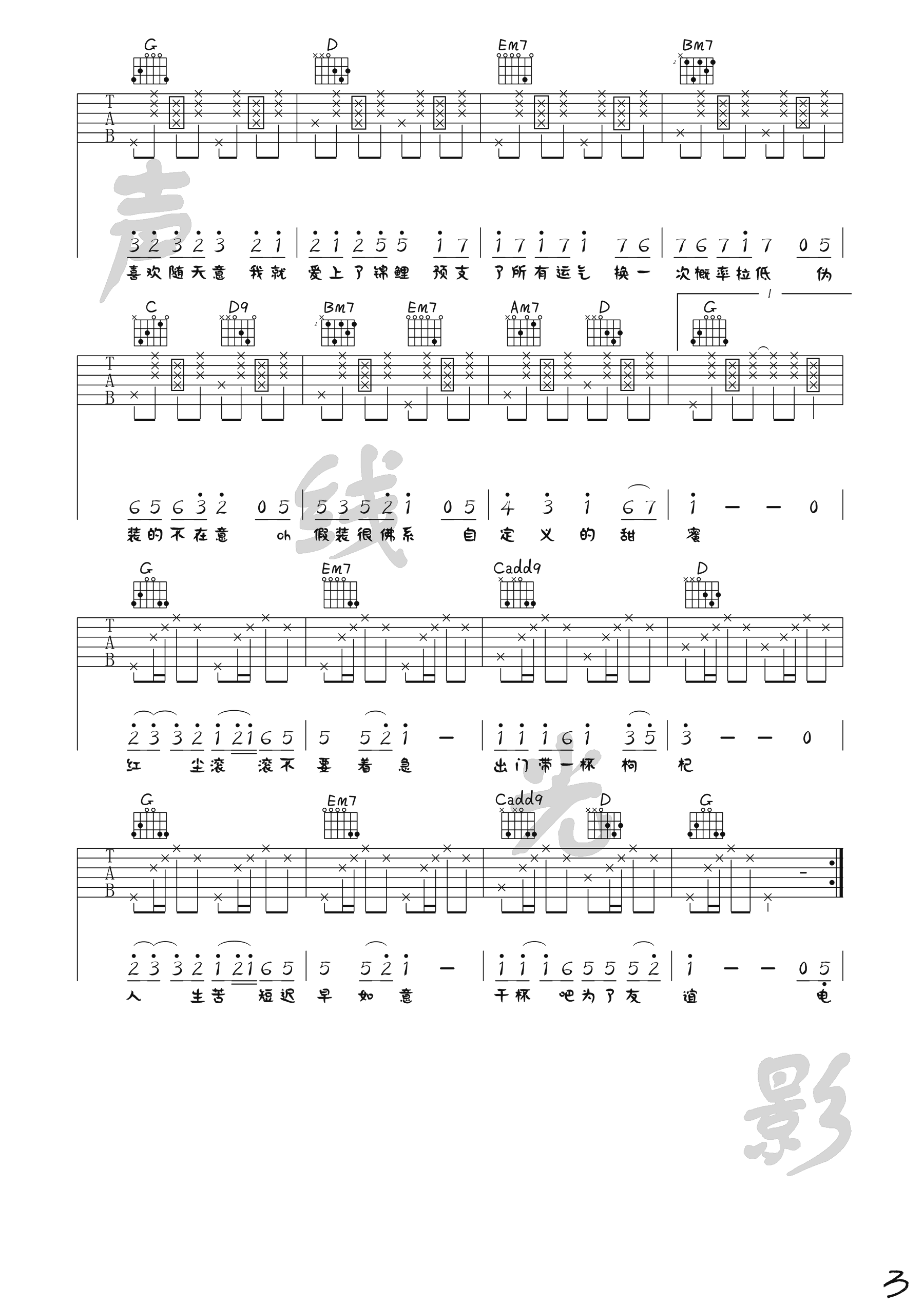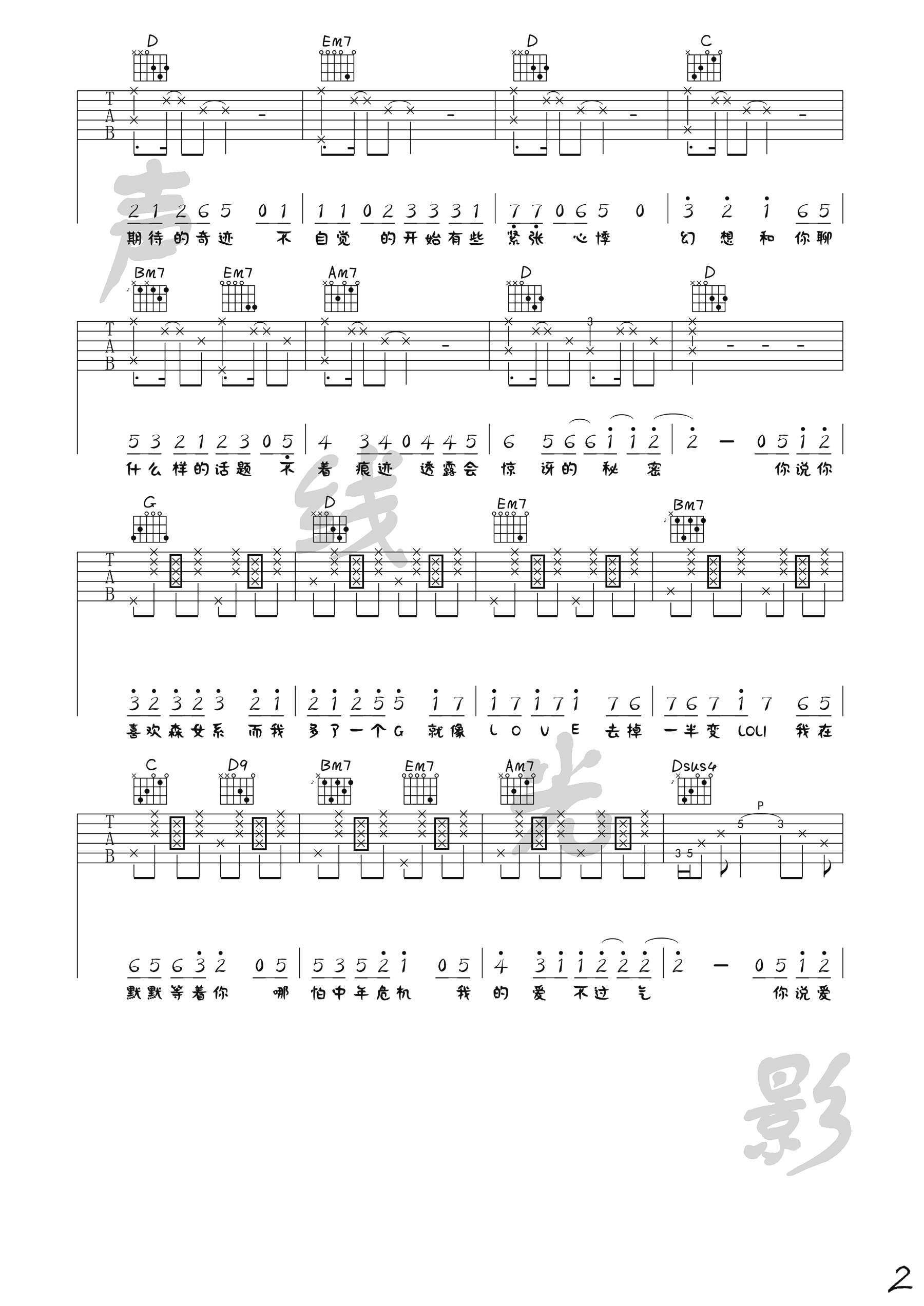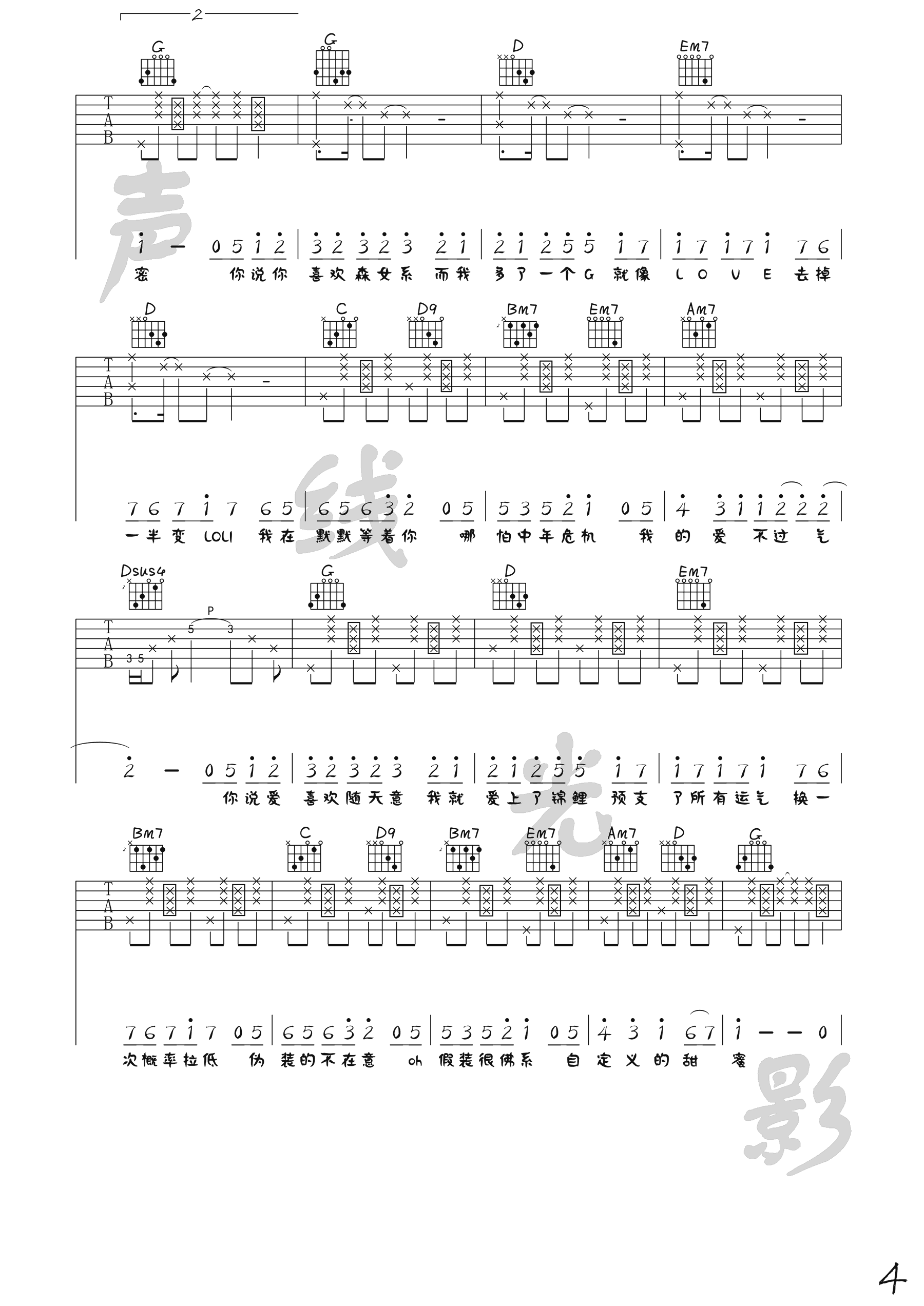 曲谱介绍: 佛系少女吉他谱,直播平台女主播冯提莫的代表歌曲,一首俏皮可爱曲风的洗脑网络热门歌曲,佛系少女六线谱,完整版共五张高清图片谱例。感谢声线光影编配出品,91吉他谱网站上传分享。随谱附上《佛系少女》吉他弹唱和教学视频,琴友们可以跟随小武老师的配套讲解进行学习。