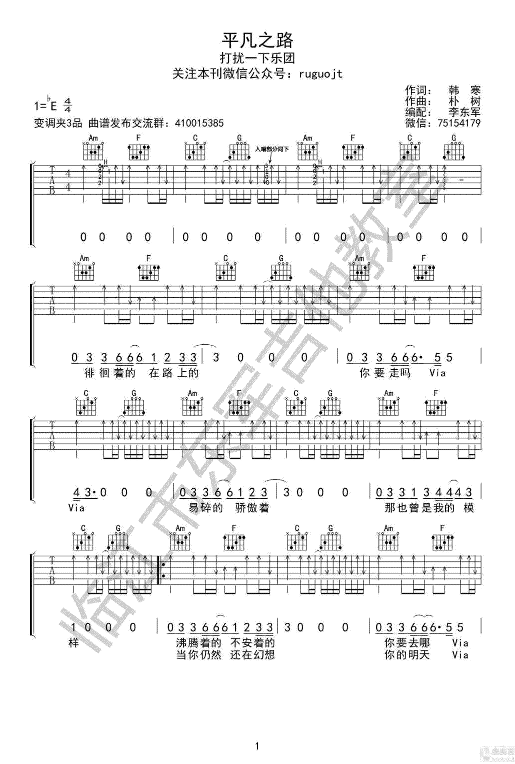 曲谱介绍: 打扰一下乐团《平凡之路》吉他谱,现场版编配,变调夹夹三品,翻唱自朴树的代表歌曲,红透网络的热门抖音歌曲,平凡之路六线谱,李东军编配,91吉他谱网站上传。 打扰一下乐团是由男主唱兼创作人陈俊豪和女主唱米可组成,自乐团成军以来改编、翻唱了众多经典曲目,《平凡之路》、《后会无期》等博得众多明星导师的认可和歌迷的追捧。