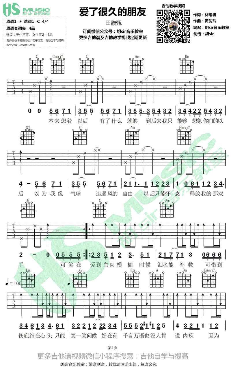 曲谱介绍: 田馥甄 爱了很久的朋友吉他谱,简单版编配,原调F选调C,变调夹夹四品,电影《后来的我们》插曲,爱了很久的朋友六线谱,胡Sir音乐教室出品,91吉他谱上传。