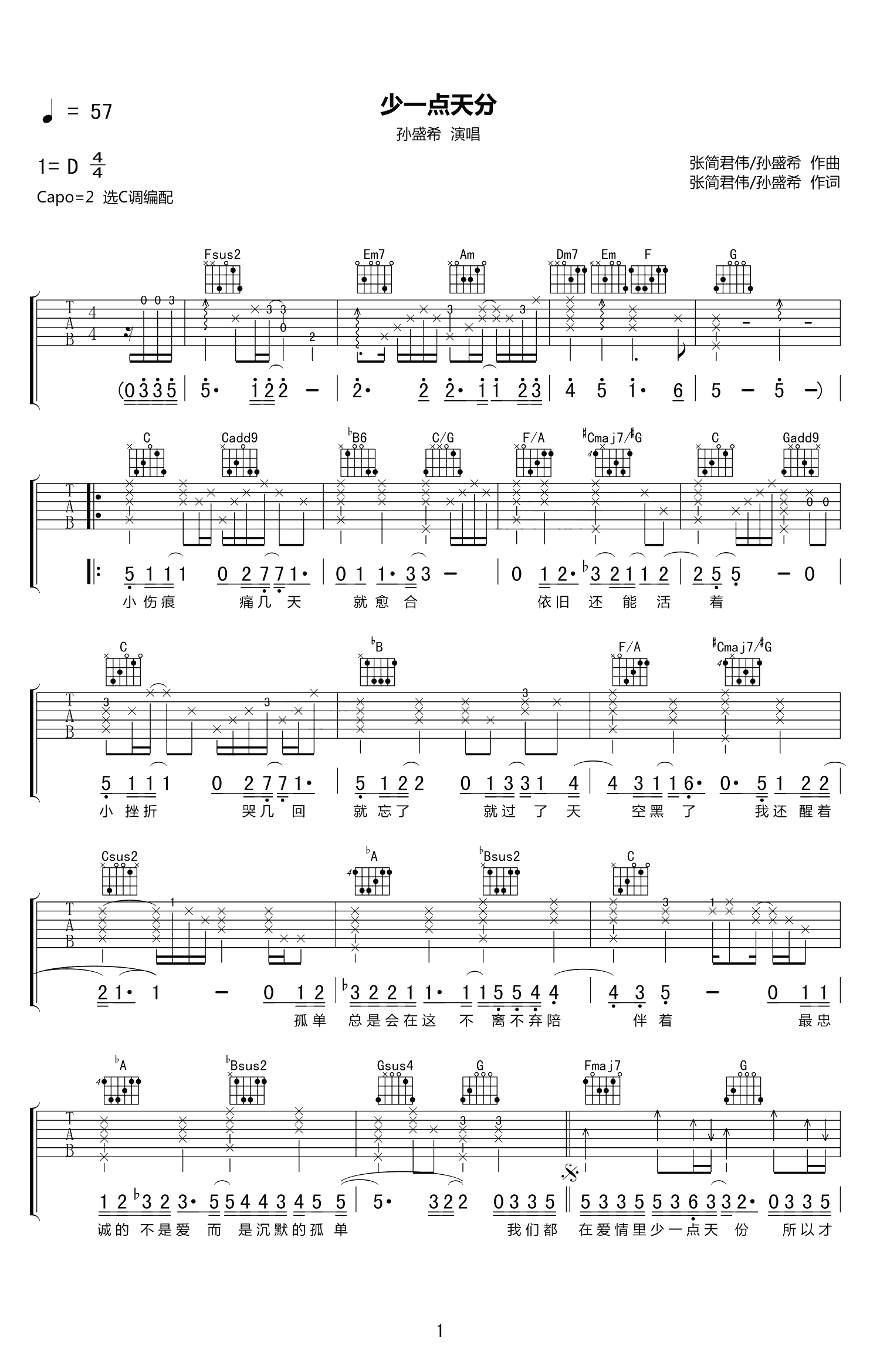 少一点天分吉他谱 - 孙盛希/王贰浪 - C调吉他弹唱谱