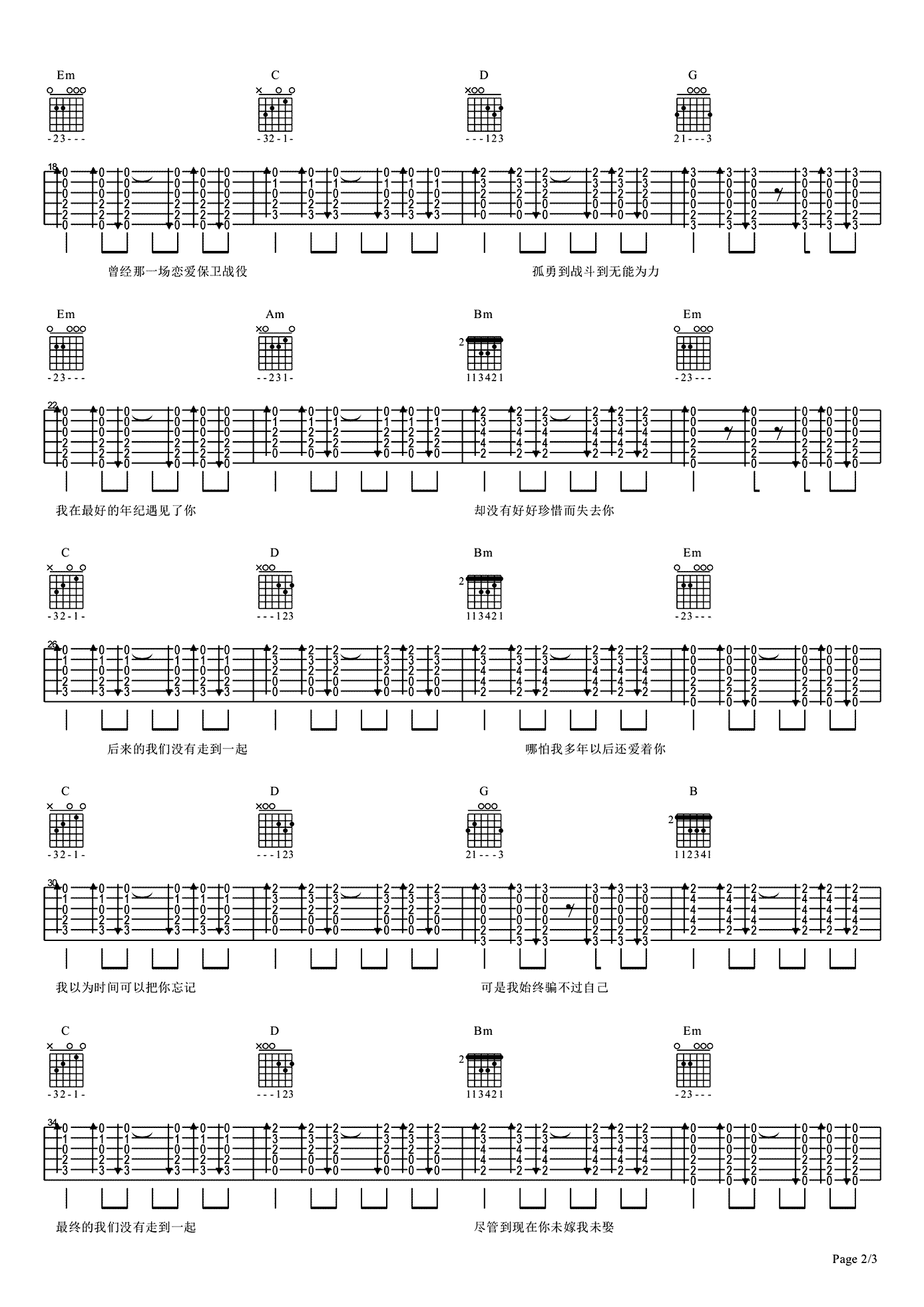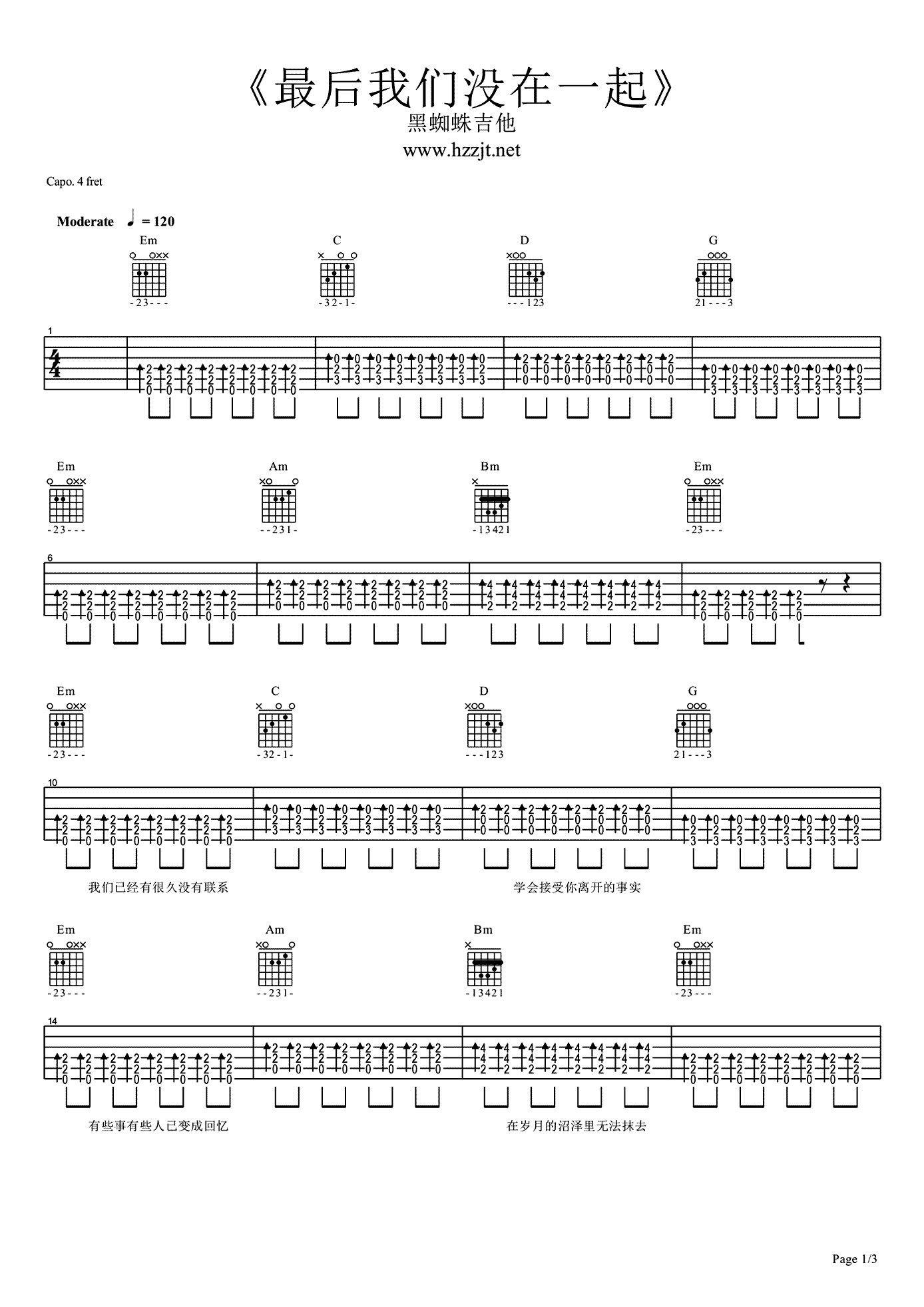 曲谱介绍: 白小白《最后我们没在一起》吉他谱,选用G调指法,Capo夹第四品,最后我们没在一起吉他六线谱,三张图片高清弹唱谱,感谢黑蜘蛛吉他编配出品,91吉他谱网站推荐分享。随谱附上歌曲的弹唱示范和教学视频,喜欢这首歌曲的琴友们跟随老师调演示和讲解练习。一首《最后我们没在一起》听哭多少有缘无份的人,每个人都会经历一段刻骨铭心的爱情,爱让人受伤,也让人成熟,一个人还是要继续一个人的生活。