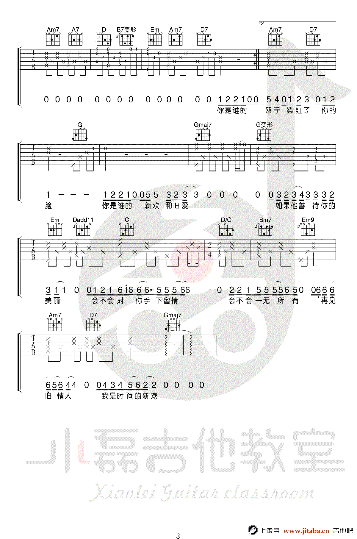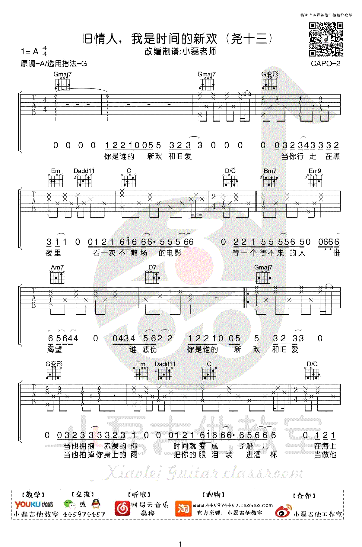 曲谱介绍: 旧情人,我是时间的新欢吉他谱,尧十三的经典代表歌曲,原调A,选用G调指法编配,CAPO夹二品,《旧情人,我是时间的新欢》六线谱,三张高清图片谱。感谢小磊吉他编配出品,91吉他谱网站整理上传。这是尧十三的代表作品,也是新专辑中比较受欢迎的一首!老师编配的这个乐谱比较合理,演奏难度已经尽可能降低,依然觉得难的同学可能自身能力要加强了,再简化原版的味道就没了!注意间奏部分和弹唱部分细微的变化!难度:6级