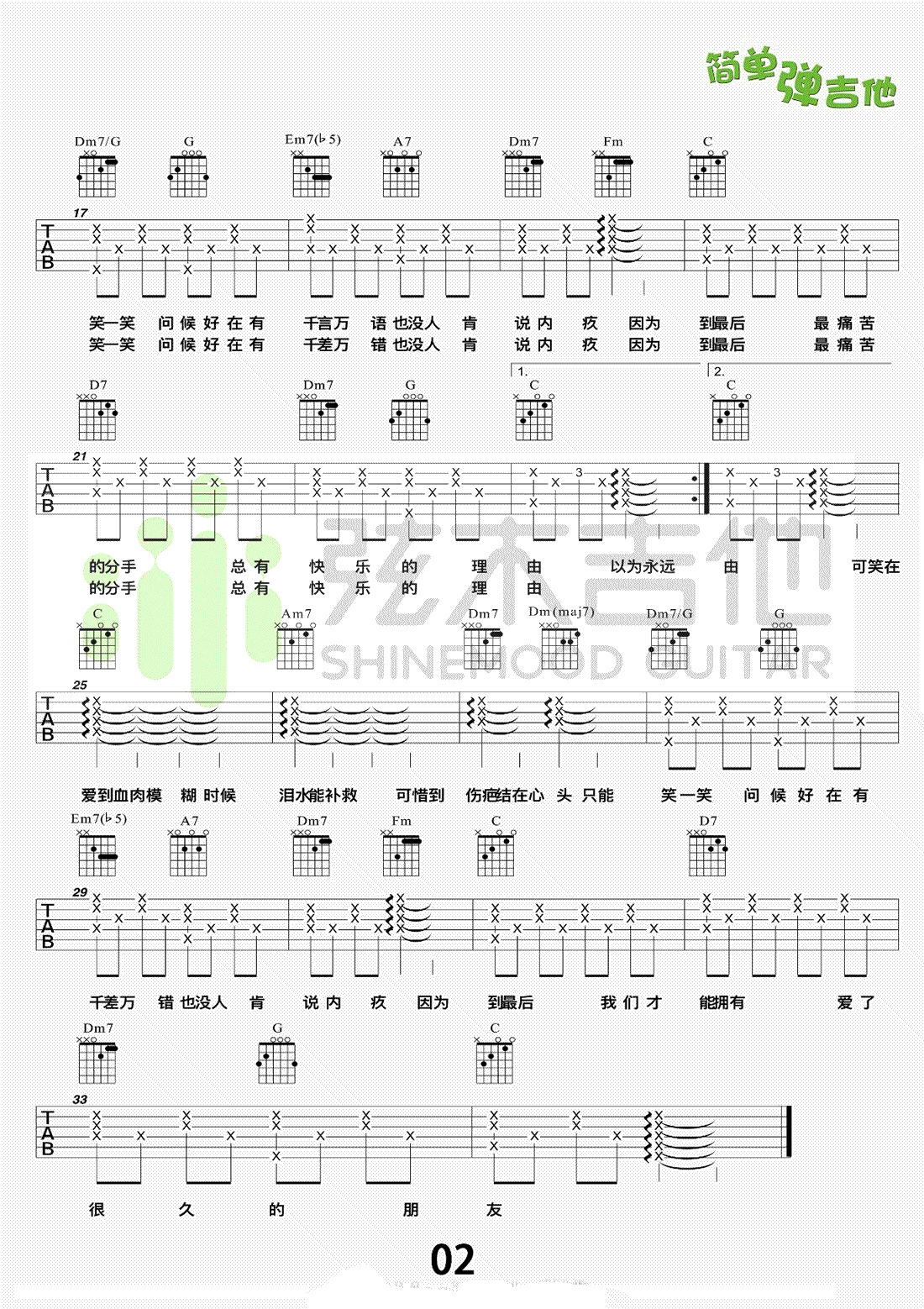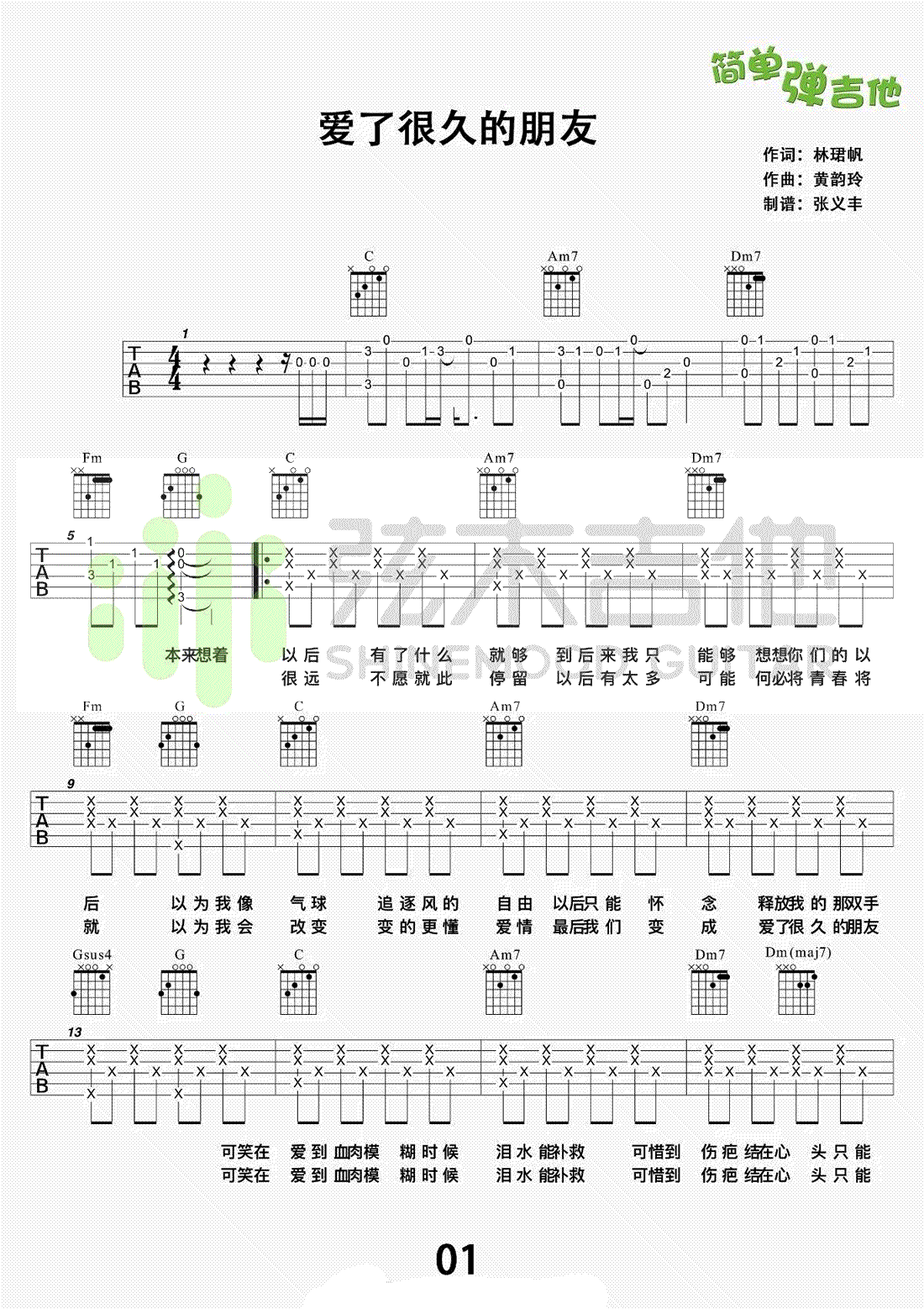 曲谱介绍: 爱了很久的朋友吉他谱,田馥甄演唱,刘若英《后来的我们》电影插曲,爱了很久的朋友六线谱,C调指法,如果女生建议变调夹夹五品,男生需要把吉他降全音调弦,高清图片谱和弹唱教学由弦木吉他编配出品,91吉他谱网站上传。田氏情歌空灵嗓音与深情唱进听众的心里,感染了每一个爱过的人,唤醒了大家爱的回忆,不禁想起自己心底那位「爱了很久的朋友」。