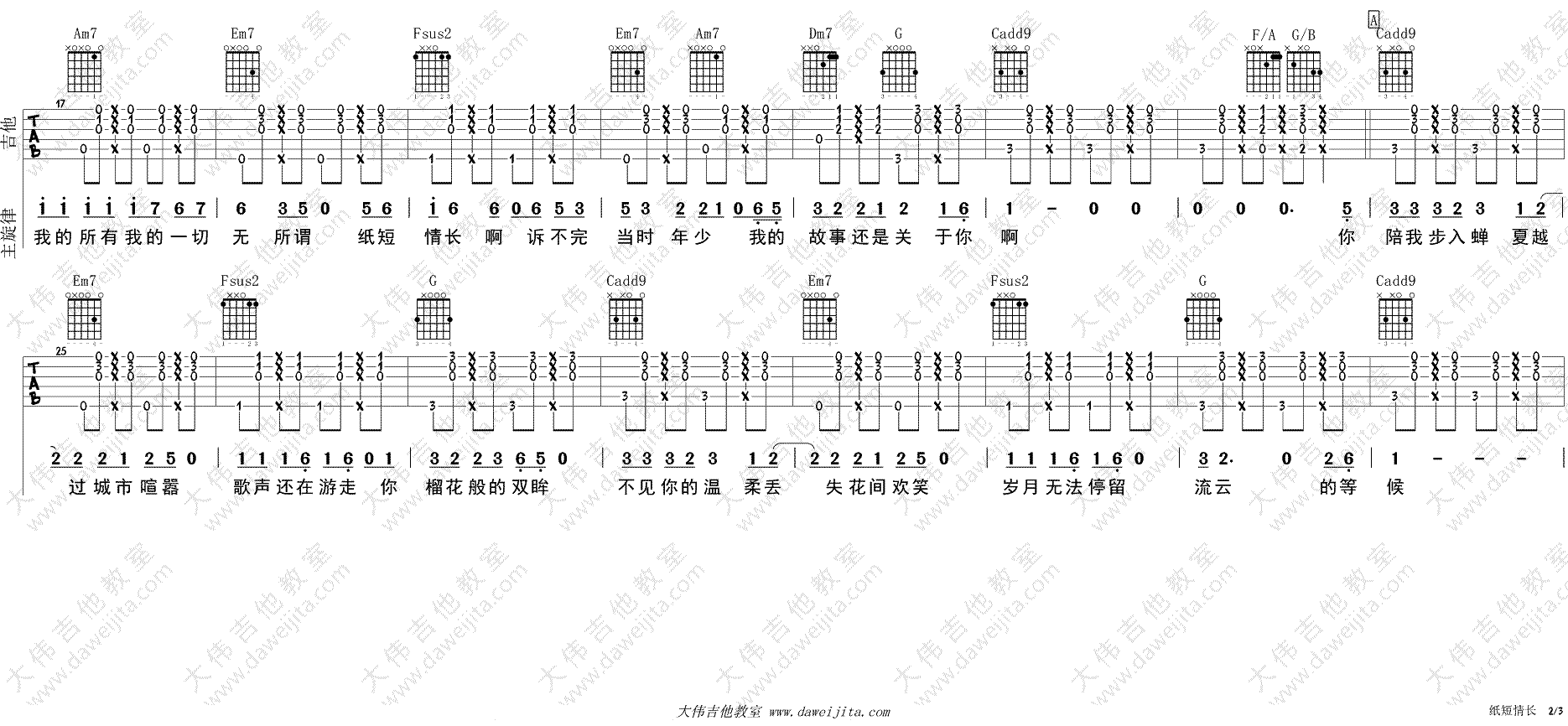 曲谱介绍: 纸短情长吉他谱,男生调曲谱,C调指法高清弹唱谱,女生推荐变调夹夹四品,和弦使用九个。一首抖音神曲,烟把儿乐队《纸短情长》吉他弹唱谱,本次为琴友们送上的是大伟吉他教室编配出品,配套吉他示范弹唱演示视频。