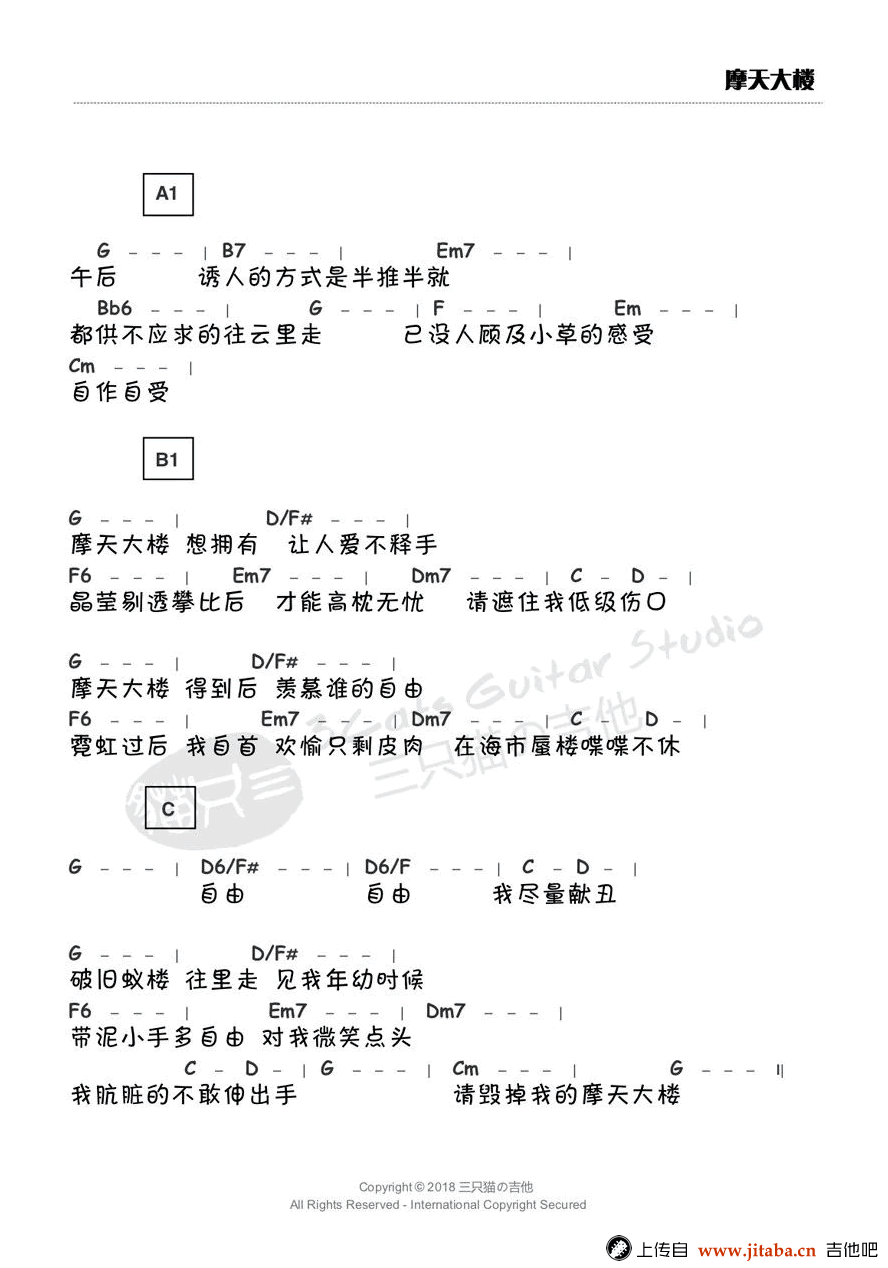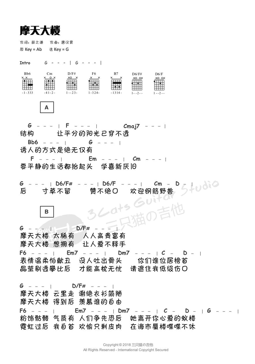 曲谱介绍: 摩天大楼吉他谱,薛之谦新歌,2018首支单曲全网首发,《摩天大楼》吉他谱,原调Ab,选调G调指法,感谢三只猫编配,91吉他谱网站上传。 瓦砾砂石,水泥钢筋,拔地而起的摩天楼宇,错节盘根展现这都市的魅力,高耸云霄看尽风光旖旎,灯红酒绿满眼纸醉金迷, 渐浓的欲望迷失最初的本心。在这城市里,我们舔舐伤口感受孤独。