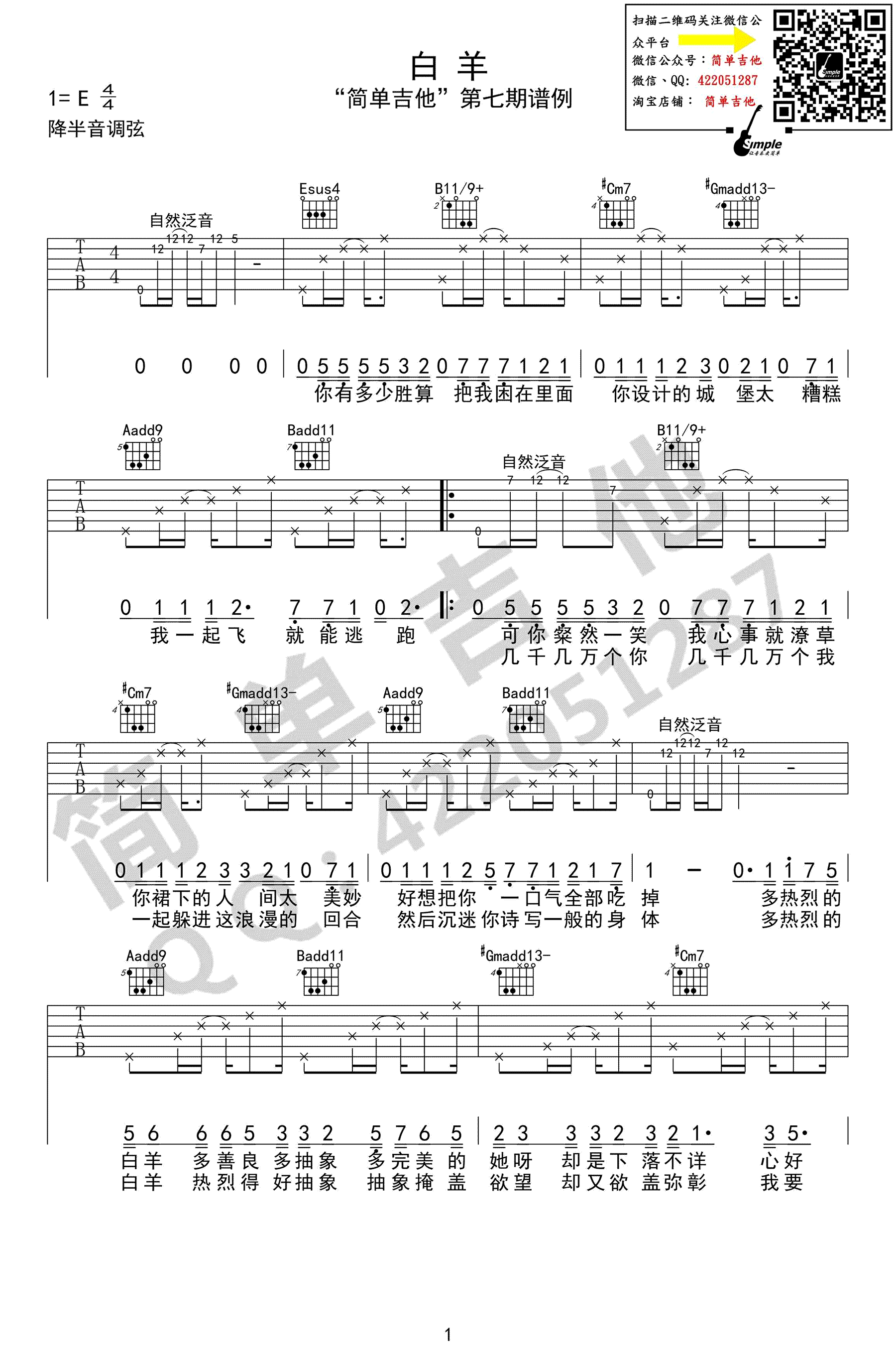 曲谱介绍: 白羊吉他谱,原版完美弹唱谱,徐秉龙沈以诚演唱,E调降半音调弦,白羊六线谱,高清图片谱。感谢西安简单吉他编配,91吉他谱网站上传。 慵懒的风格,有力的腔调,自信又矛盾的词句,这很白羊。一首热门的网络歌曲,清澈温暖的歌声唱成了一场倾诉,倾诉青春的欢喜而无望、懵懂却倔强。