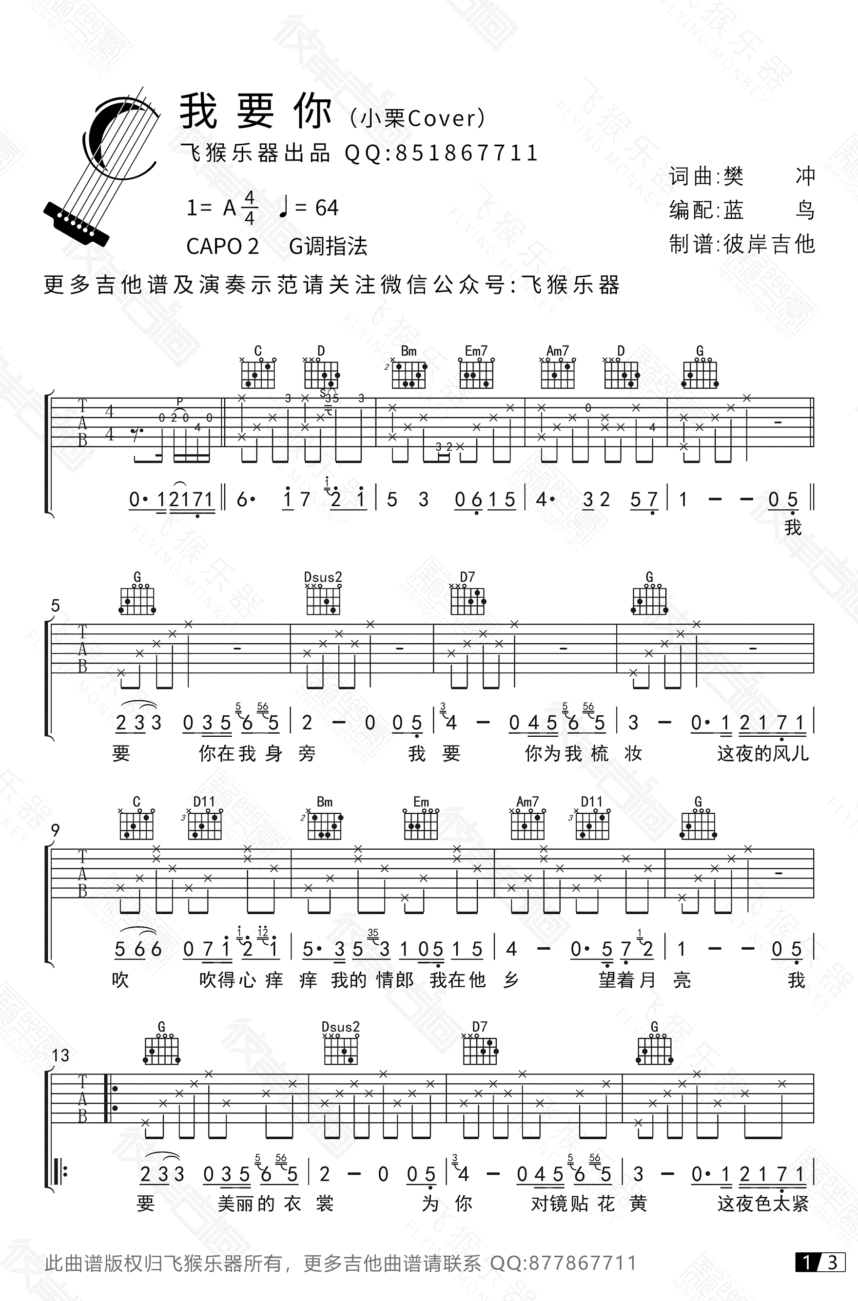 我要你吉他谱 - 飞猴乐器 - G调吉他弹唱谱