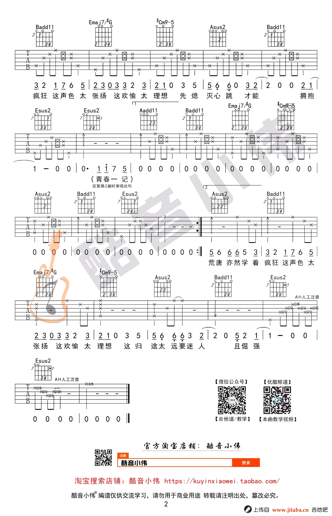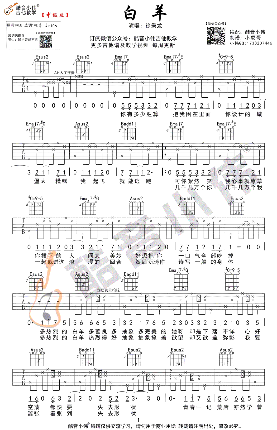 曲谱介绍: 白羊吉他谱,选用E调指法中级版编配,男生降半音或不夹,女生演唱可以参考相关曲谱栏目发布的C调简单弹唱版本。白羊六线谱,高清图片谱,感谢酷音小伟出品,随谱附上配套吉他弹唱和教学视频,琴友们参照小伟老师的示范讲解学习。整首歌曲难点不多,请按分段分小节和朗读节拍来弹奏旋律,从基础把握感觉练习。