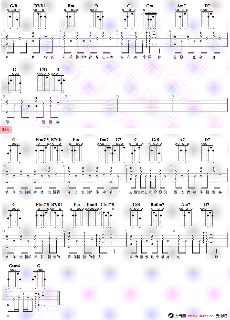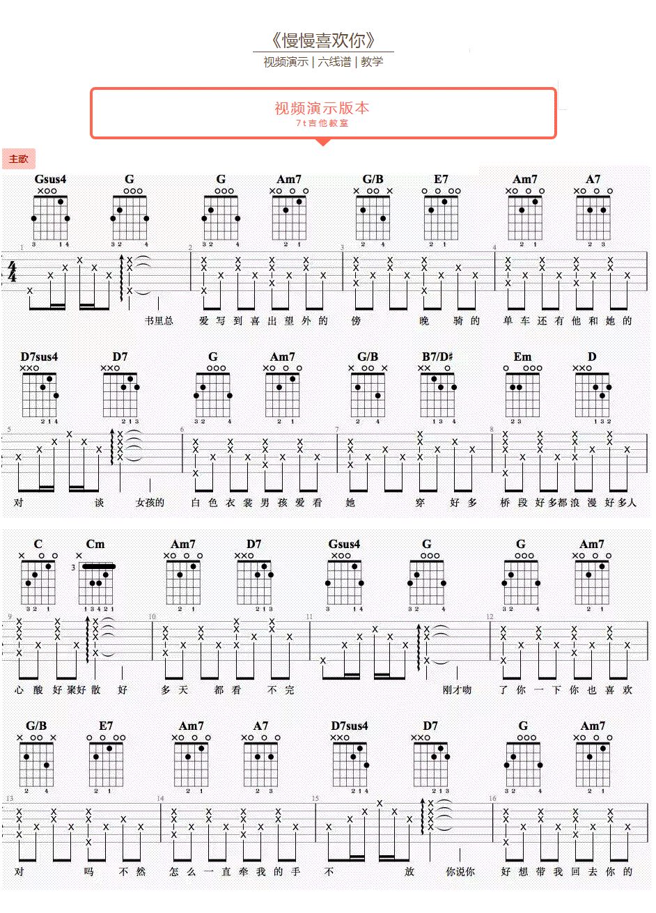 曲谱介绍: 慢慢喜欢你吉他谱,莫文蔚演唱,慢慢喜欢你吉他弹唱谱,附上图片谱配套弹唱视频示范,感谢7T吉他教室出品,91吉他谱整理上传。 老师的编配说明这首歌我用了很多和弦,主要是原曲本身的和弦编配就非常丰富,大概是因为词曲都是李荣浩所作?感觉他和周董的创作都喜欢玩大量的高端和弦用法。虽然和弦数量有点多,不过大部分的按法都不难,只是有些可能大家平时较少按过,需要花点时间熟悉一下哦~ 原曲是G大调,谱子也是按G大调来编配的,男声可以根据自己的音域使用变调夹,大概夹2~4品都正常,我音域比较低就只夹了1品。