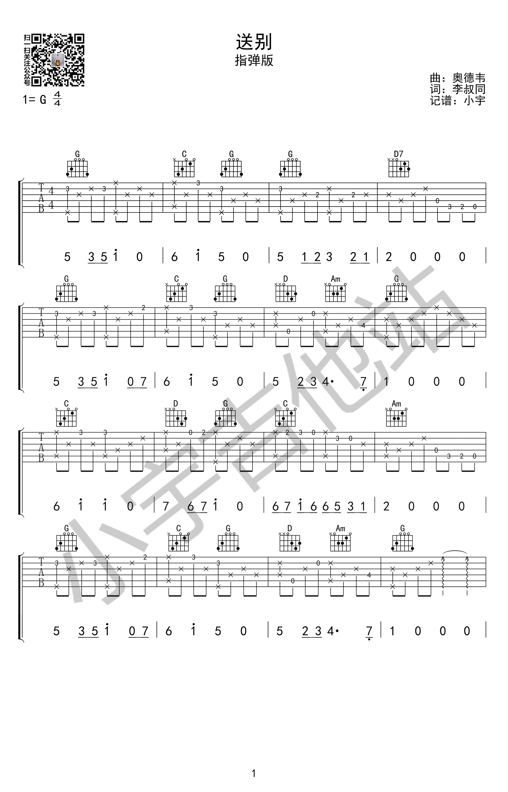 曲谱介绍: 送别指弹吉他谱,好听的简单版,送别吉他独奏谱,高清图片谱。小宇记谱,91吉他谱网站上传。 长亭向晚今宵梦别,一曲朋友之间挥手相送的骊歌,感情真挚,意蕴悠长。山长水远,知交零落,勾起人们对旧事的怀念,感悟人生的悲伤。