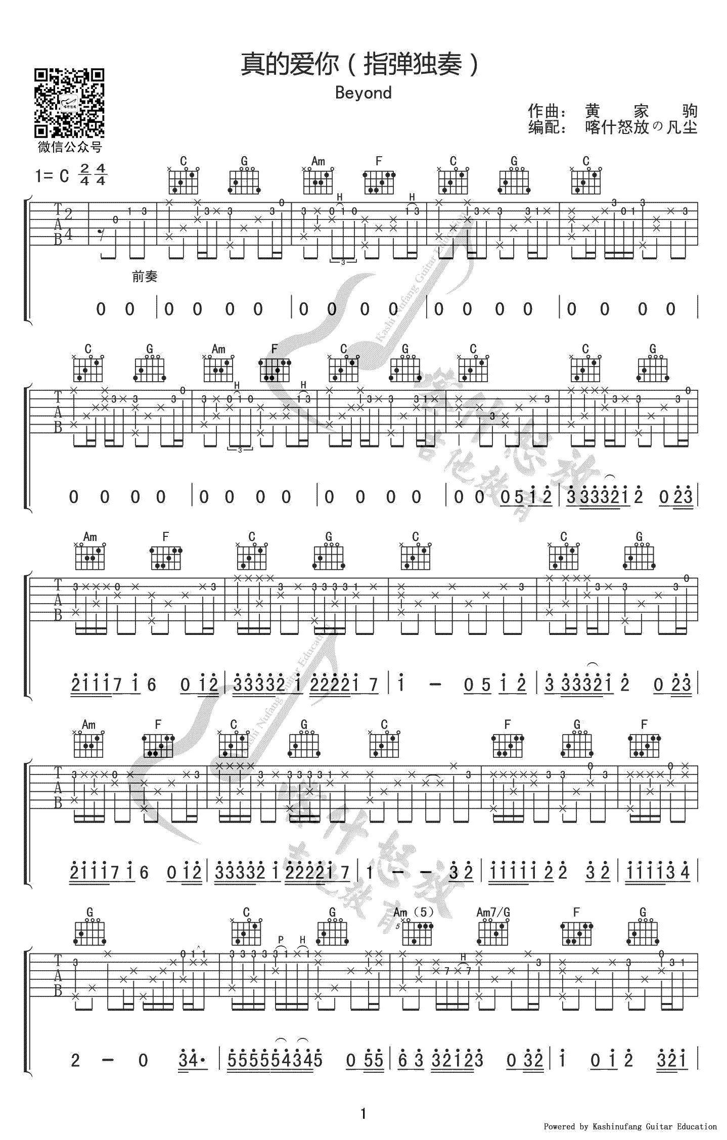 曲谱介绍: 真的爱你吉他谱指弹版,黄家驹作曲,Beyond乐队的经典代表歌曲,真的爱你指弹吉他独奏谱,C调指法,高清图片谱,感谢喀什怒放编配出品,91吉他谱上传分享。 这是吉他爱好者必学弹的一首曲目,那激昂强劲的吉他前奏、那优美连贯的吉他solo,让众多乐迷痴迷,每当听到坚定又昂扬的旋律,都不禁让人沉醉其中。