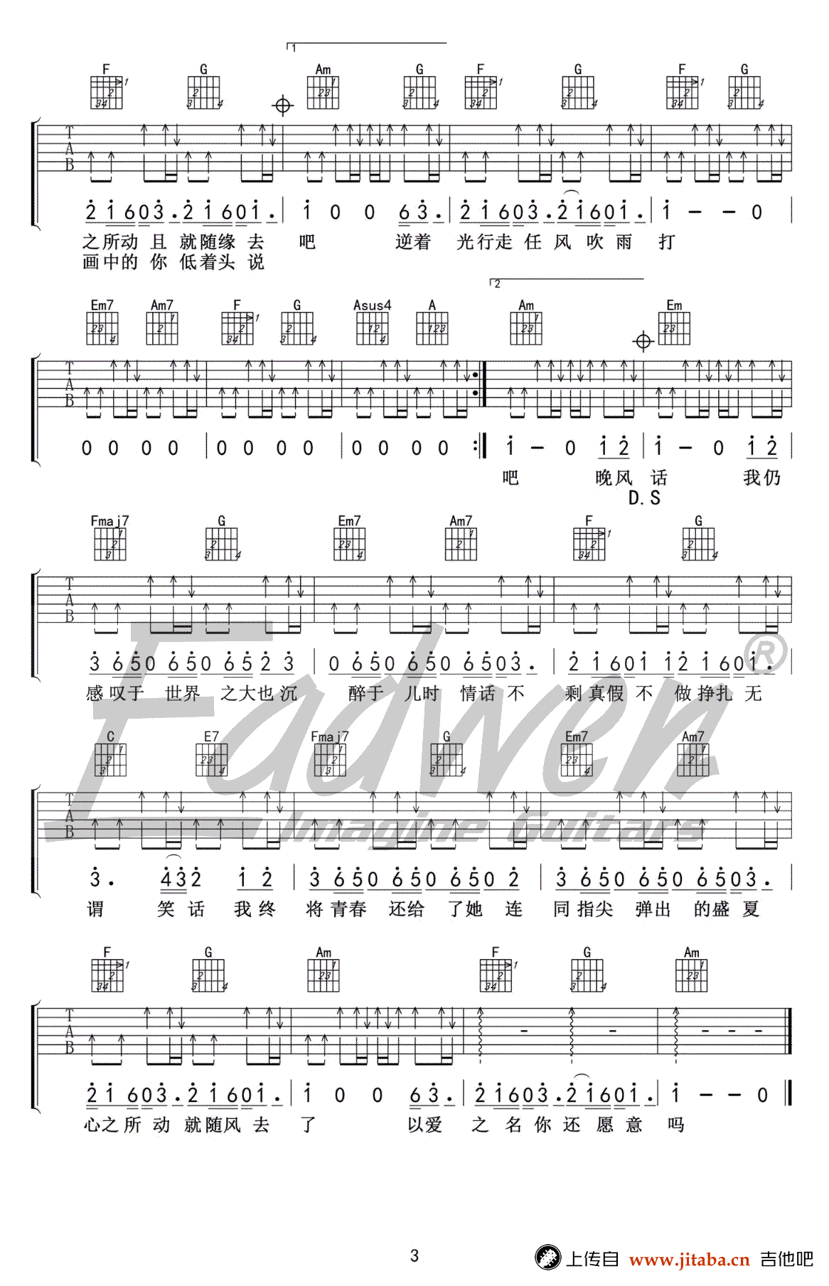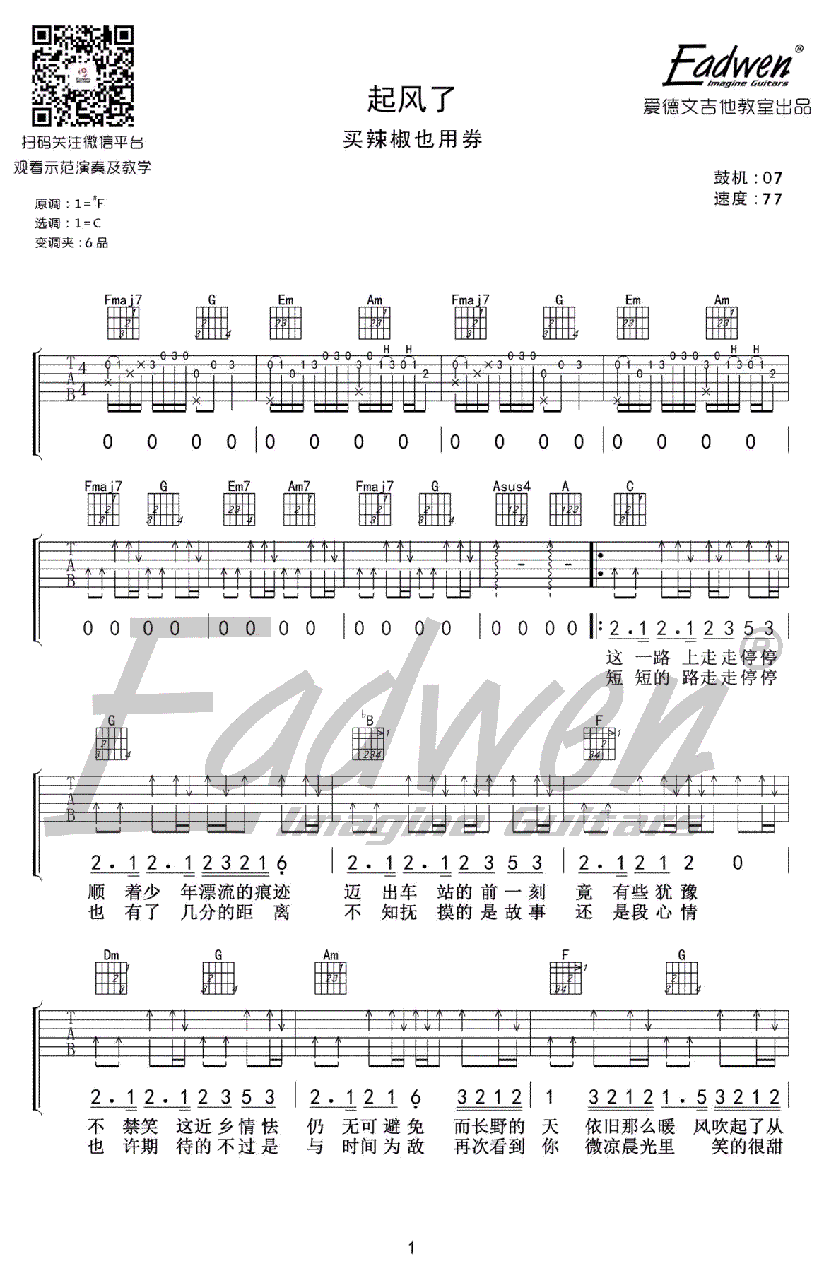 曲谱介绍: 买辣椒也用券《起风了》吉他谱,原调#F,选调C,变调夹夹六品。起风了六线谱,高清图片谱三张谱例,感谢爱德文吉他出品,91吉他谱网站上传分享。一首很火的网络歌曲,抖音平台热门音乐,原曲为钢琴伴奏,这里改编成吉他演奏,尽量保留原版风格,本曲谱前奏略难,整首歌曲的知识点还是有些多,琴友们可以配合老师的讲解教学视频练习掌握。