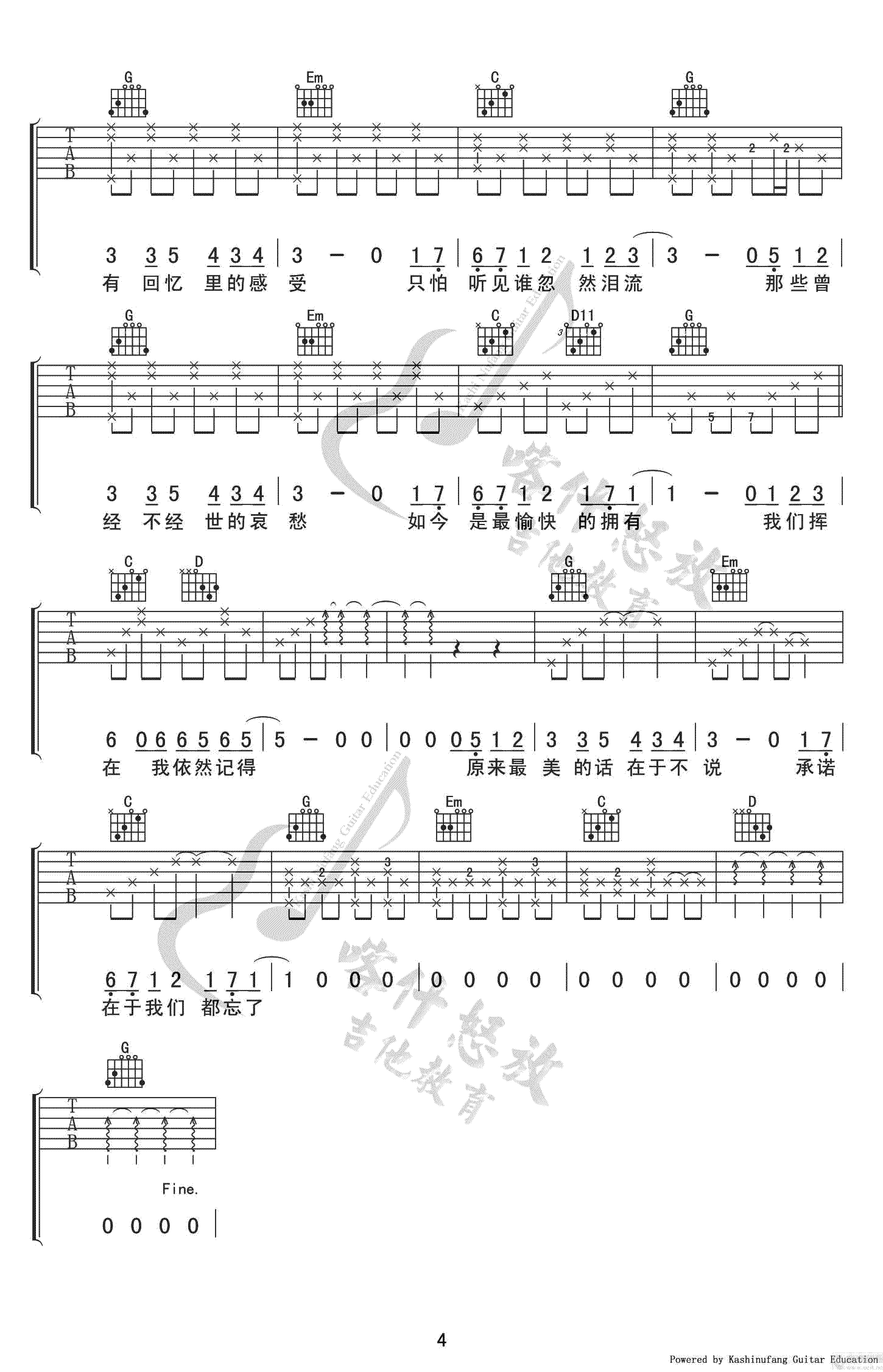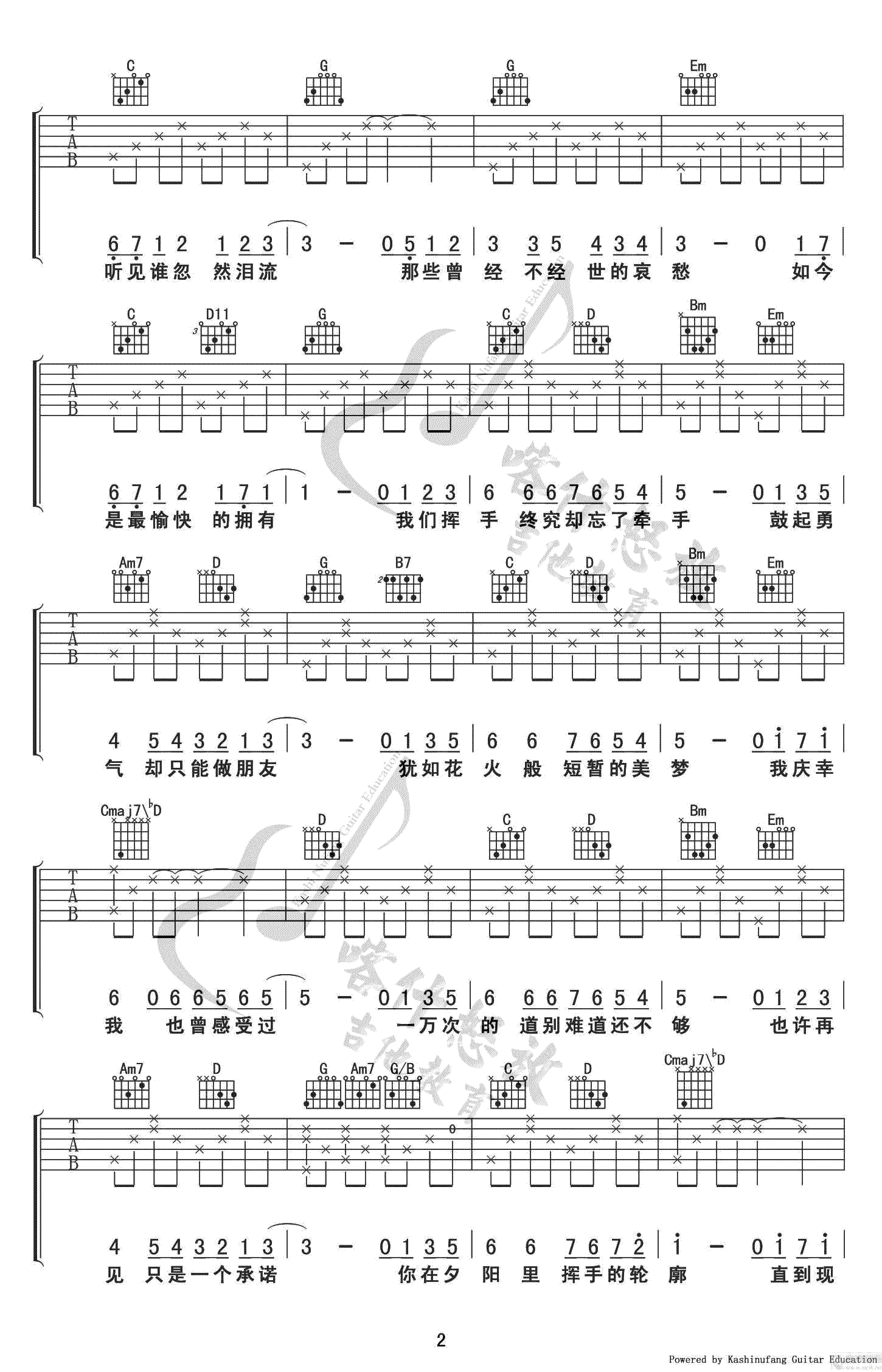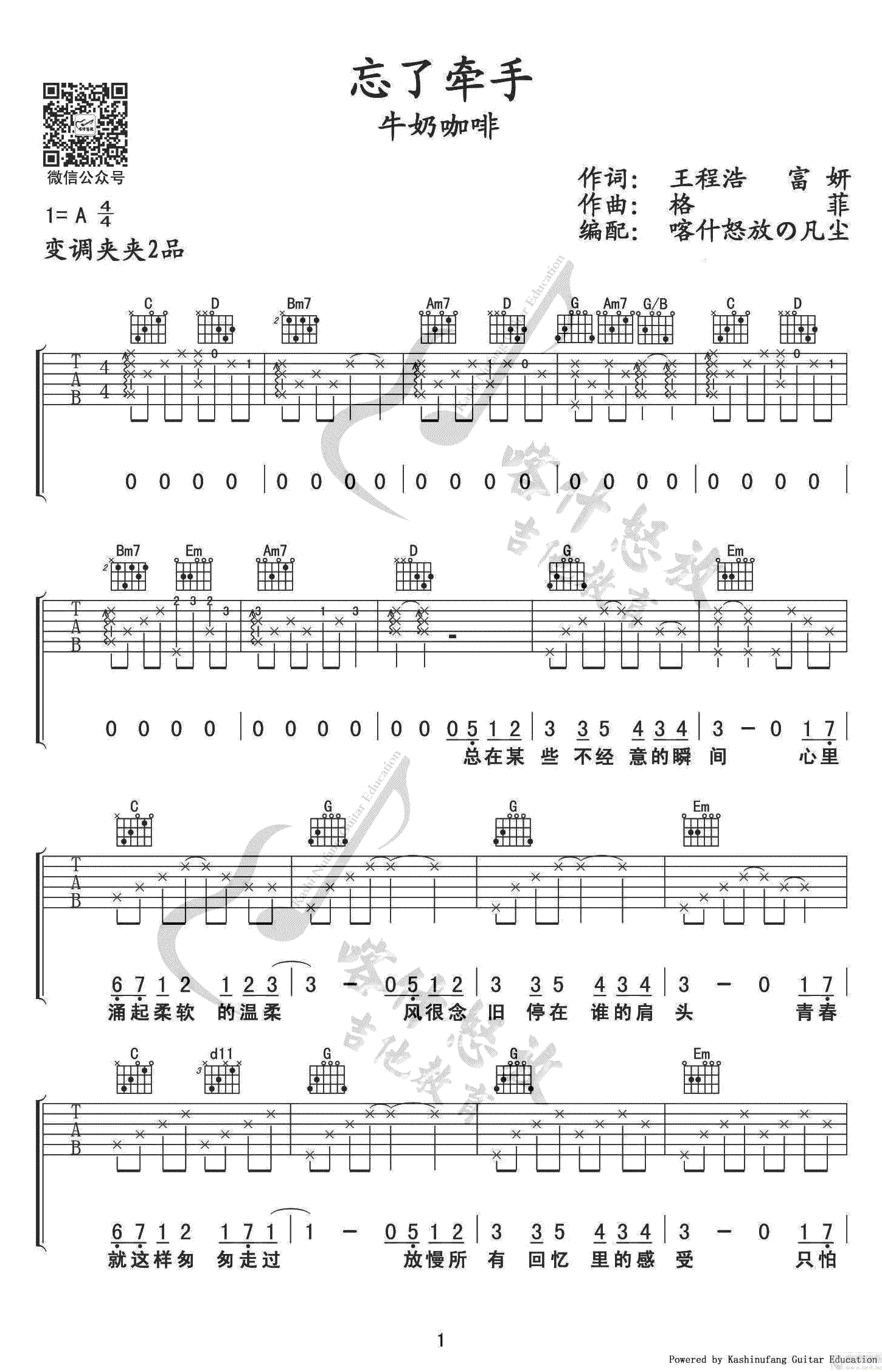 曲谱介绍: 忘了牵手吉他谱,牛奶咖啡演唱,变调夹夹第二品,忘了牵手吉他弹唱谱,高清图片六线谱,感谢喀什怒放出品,91吉他谱网站上传。 电视剧《旋风少女》演唱的插曲,旋律朗朗上口,略带忧伤又充满温暖的声音,唱出青春岁月里每个人心中最美好的回忆。