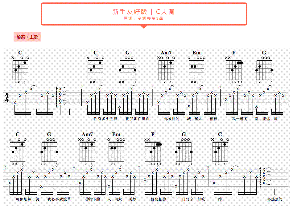 曲谱介绍: 白羊吉他谱,徐秉龙演唱,这首热门歌曲已经有很多编配版本了,这次是7T吉他教室出品,为吉他新手送上两个简单版的谱子,分别是C调和G调,配置的和弦都是大家非常熟悉的~改成其它调以后,前奏的泛音因为不是空弦的自然泛音,而是需要按弦的人工泛音,难度更大了,所以老师把前奏简化成正常拨弦,毕竟是简单版。 原曲是Eb调,男生可以夹变调夹第3品,用C调的谱子弹出原调;女生可以直接选择G调的谱子来弹,感觉太低的话可以适当使用变调夹哦~