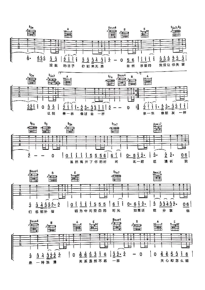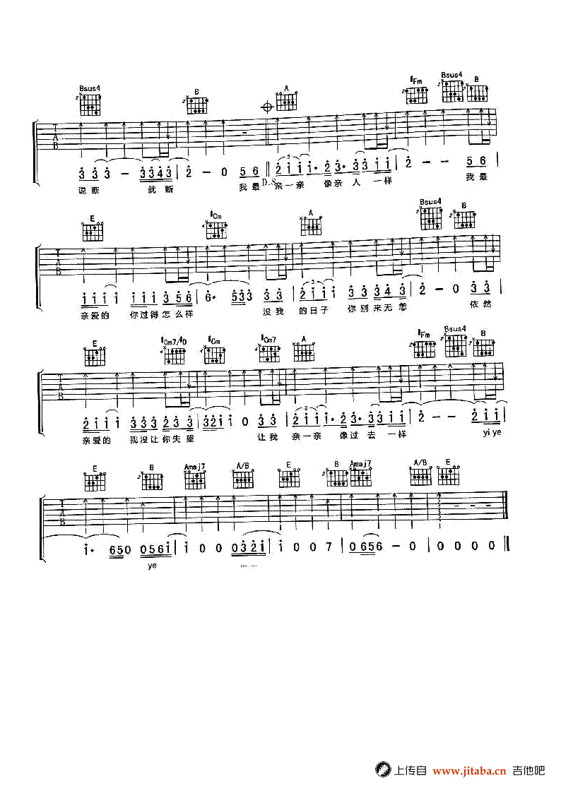 曲谱介绍: 我最亲爱的吉他谱,E调指法,张惠妹的一首经典代表歌曲,在当年成为最具流行和最催泪的作品,我最亲爱的六线谱,感谢吴建华编配,91吉他谱网站上传。 歌曲描写与爱人分开后,某时突然想起过往,那种已经释怀却又带点酸楚的滋味。有些人,无论当初如何约定, 终是走着走着就散了。 他日街头偶遇,江湖重逢, 纵繁词万千, 不过一句“别来无恙”吧。