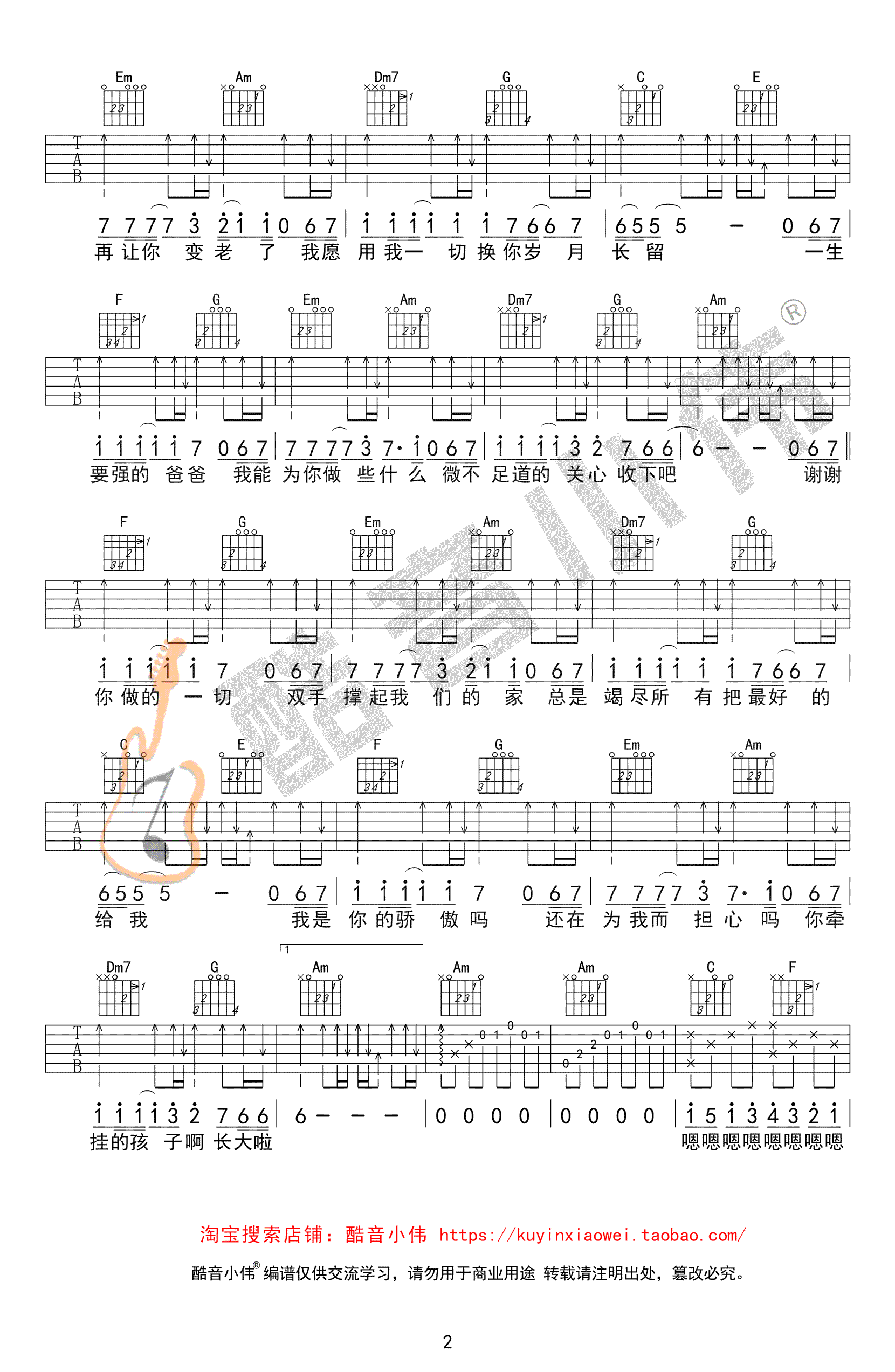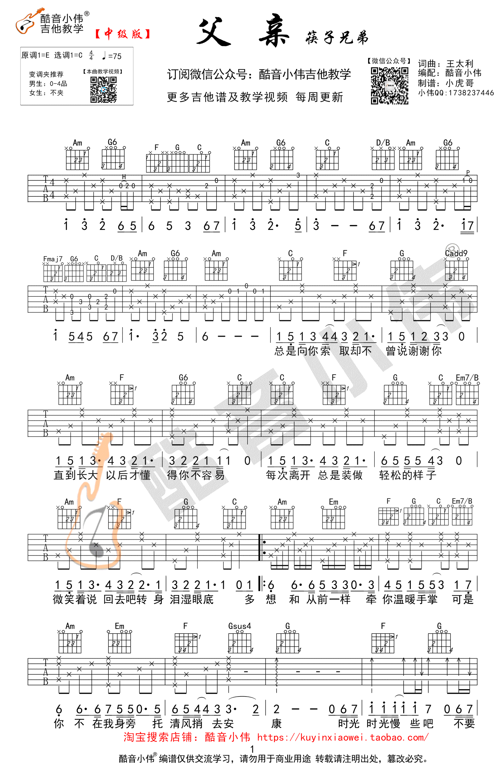 曲谱介绍: 父亲吉他谱,筷子兄弟的一首经典吉他弹唱歌曲,本曲谱为中级版编配,原调E,选调C,变调夹男生0-4品,父亲六线谱,高清图片谱三张谱例,感谢酷音小伟编配出品,91吉他谱网站附上《父亲》吉他弹唱教学视频,琴友们参照配套曲谱跟随老师调讲解示范进行练习。