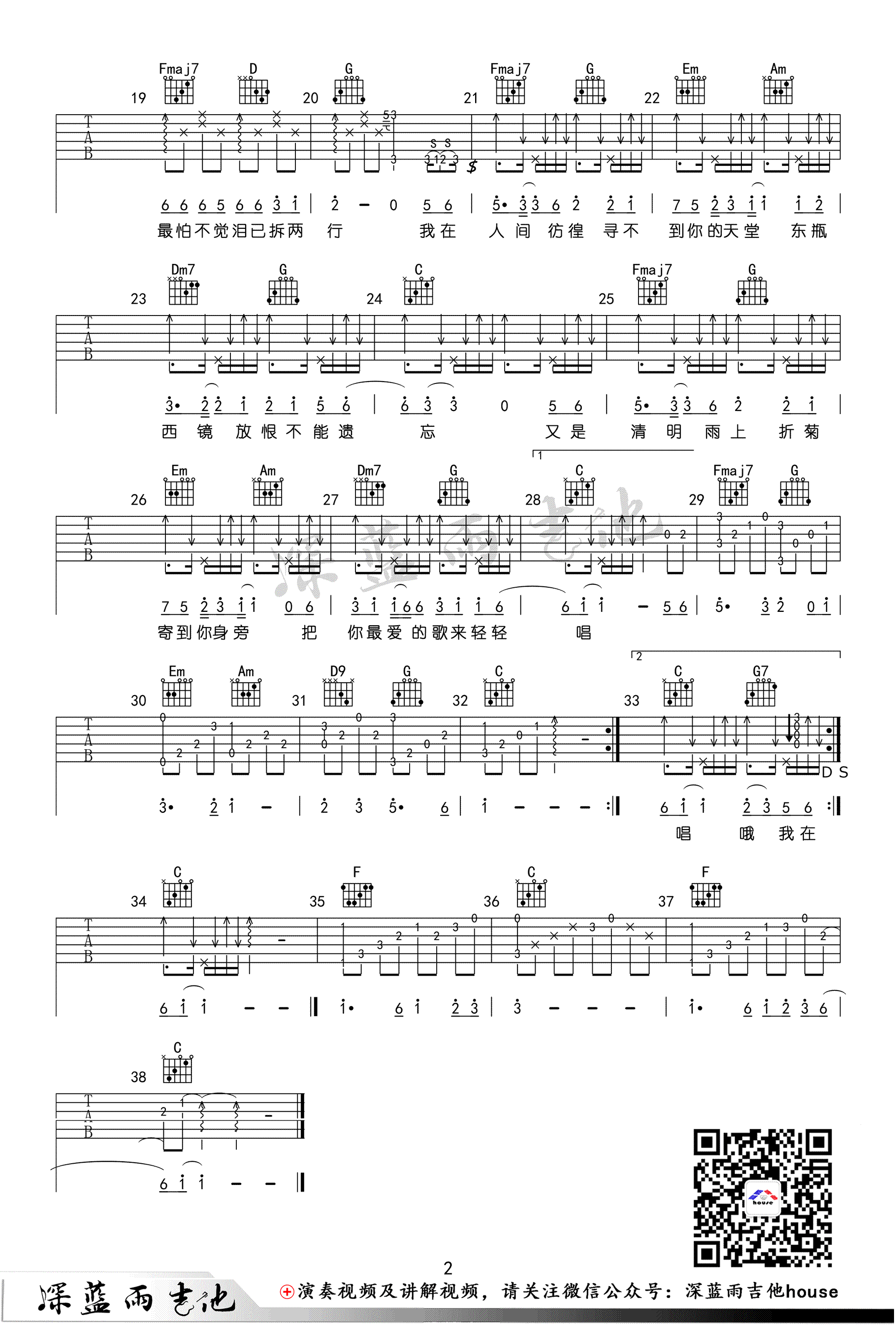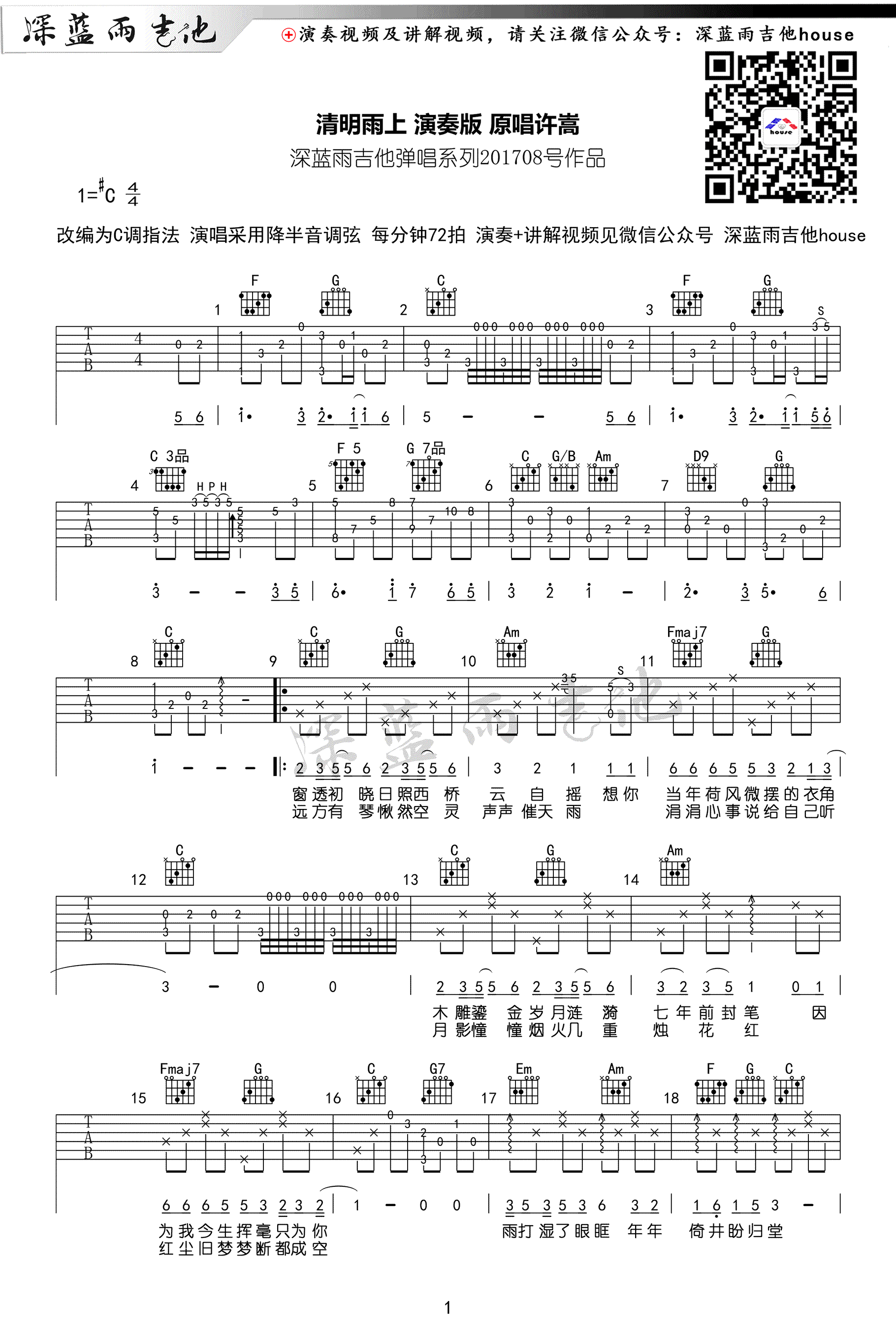 曲谱介绍: 清明雨上吉他谱,许嵩的一首中国风歌曲,复古的歌词极押韵,唱起来朗朗上口,原调#C,改编为C调指法,演唱采用降半音调弦,清明雨上六线谱 ,高清图片谱,感谢深蓝雨吉他编配,随谱附上老师带来的配套弹唱和教学视频,琴友们参照练习。动听的旋律缓缓流淌,仿佛有无尽的哀伤,缓缓地诉说我们的思念。 《清明雨上》吉他弹唱视频: