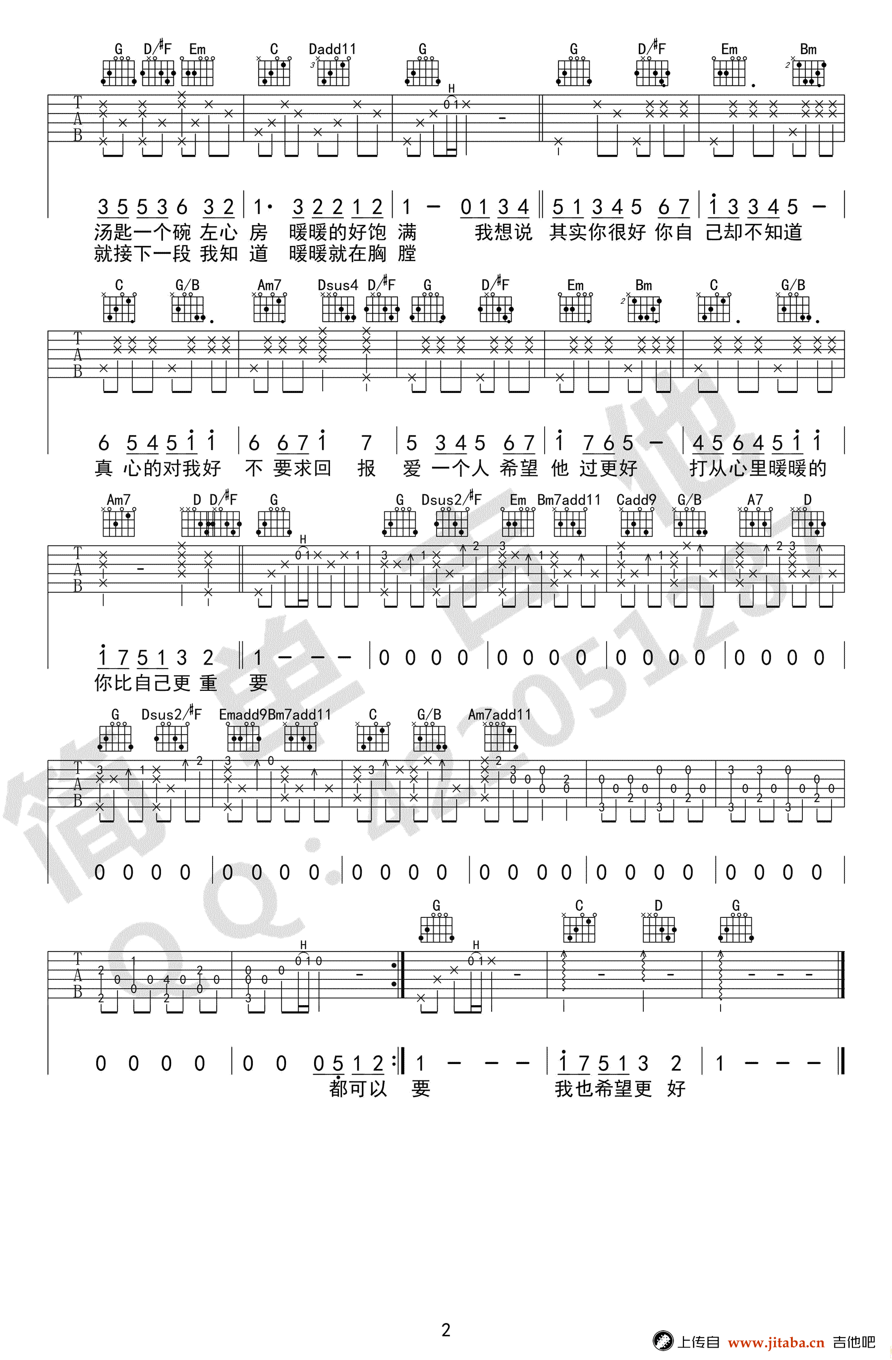 曲谱介绍: 暖暖吉他谱,梁静茹演唱甜蜜情歌的代表作,G调,变调夹夹四品,暖暖吉他弹唱谱,高清图片六线谱,西安简单吉他编配,91吉他谱网站上传。 一首非常甜蜜的治愈情歌,恬淡温暖的旋律和歌词,梁静茹细腻感的唱出平凡的爱情的快乐幸福。