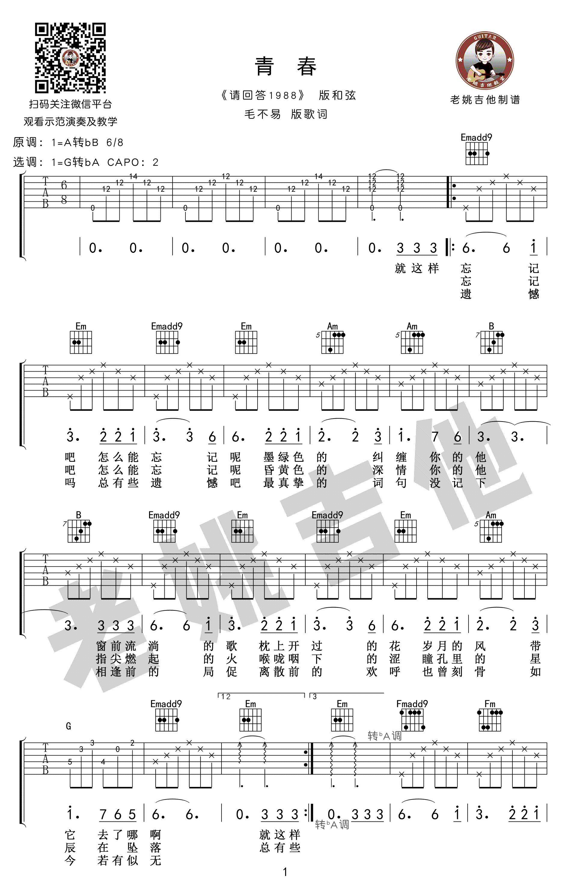 曲谱介绍: 毛不易《青春》吉他谱,韩剧《请回答1988》主题曲中文版,青春六线谱,G调转降A调,CAPO夹二品,三张高清弹唱图片谱。感谢老姚吉他编配出品,并带来吉他弹唱教学视频,91吉他谱推荐上传。 《请回答1988》里平凡却真实有爱的故事, 让多少人哭着不舍这部剧的完结, 又有多少人将主题曲《青春》设为单曲循环, 毛不易将这首经典之作重新填词翻唱, 改编成中文版,开口瞬间唤起观众的记忆。