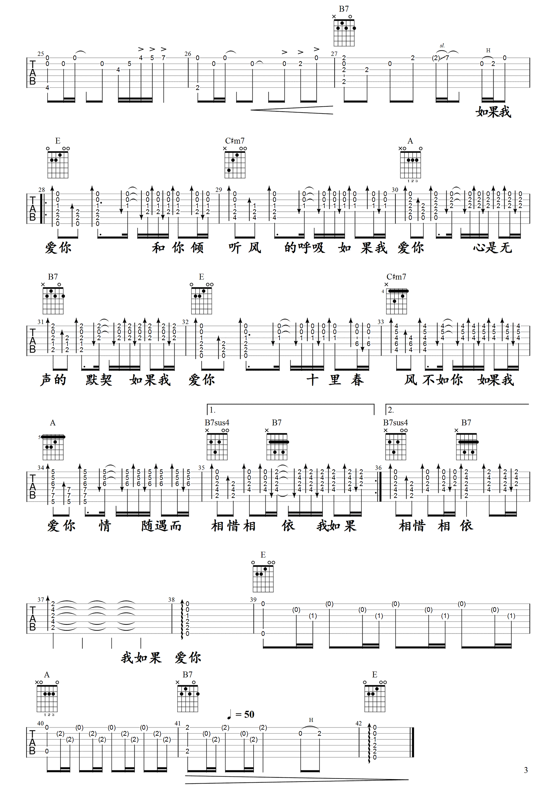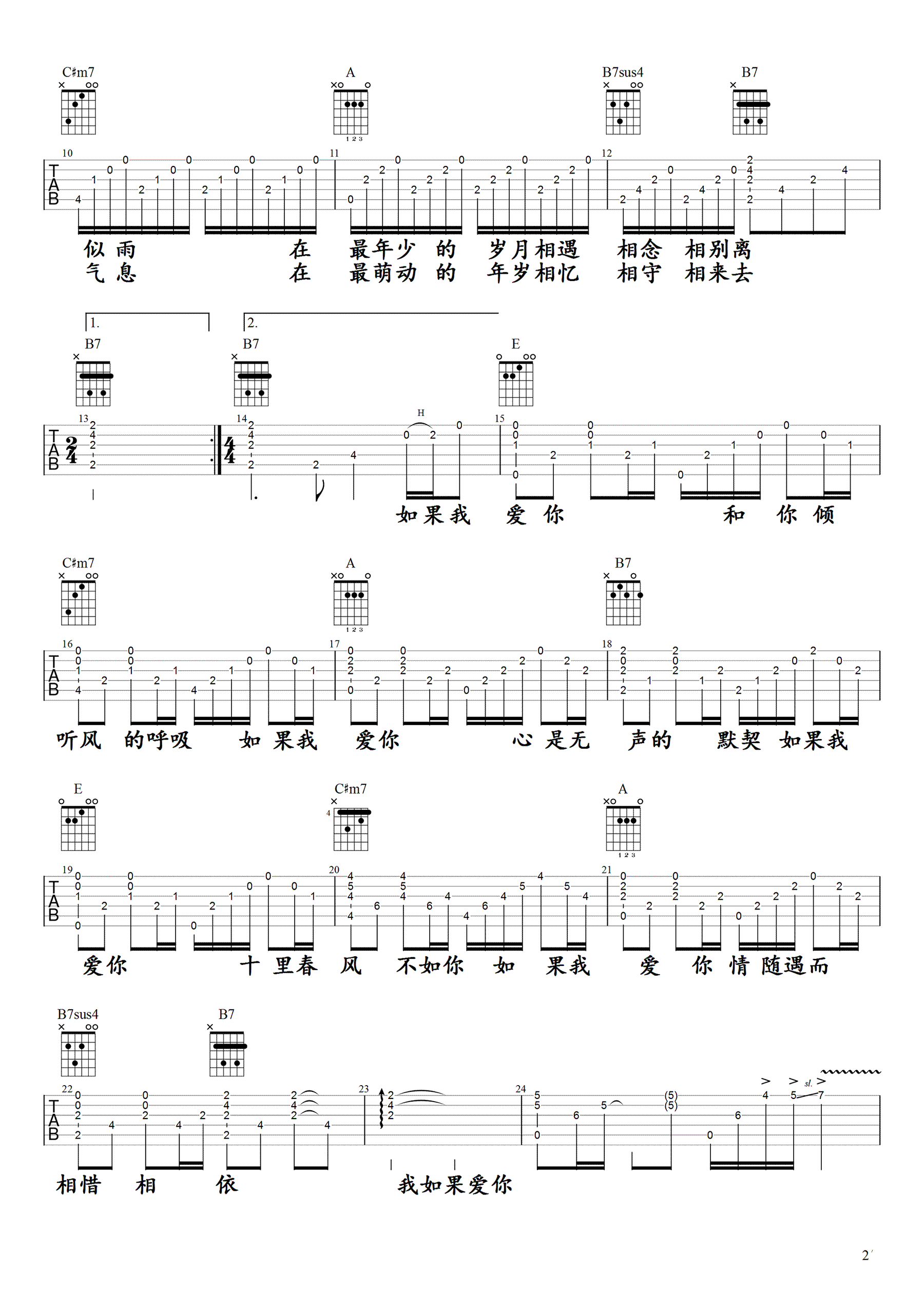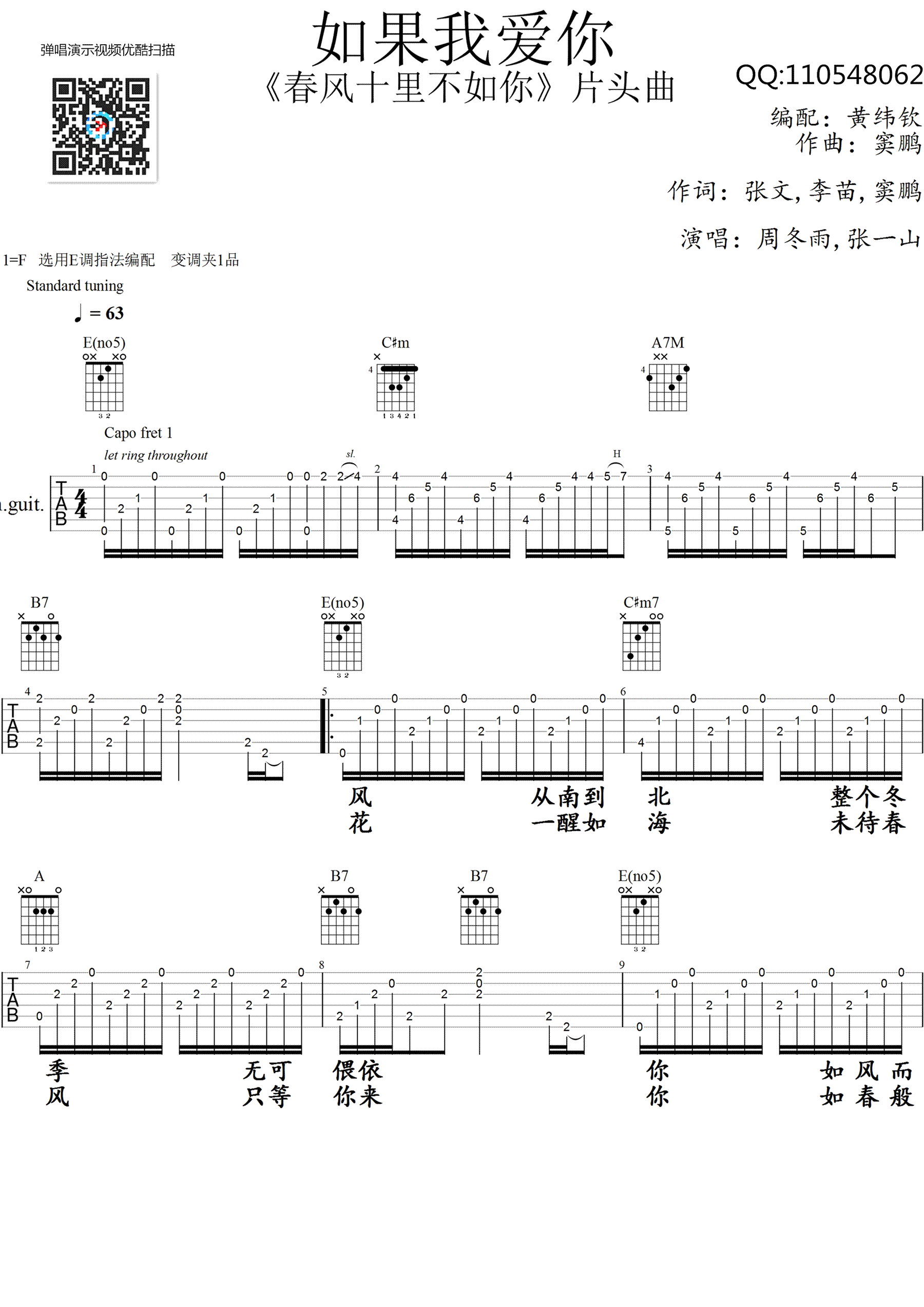 曲谱介绍: 如果我爱你吉他谱,张一山周冬雨演唱,电视剧《春风十里不如你》主题曲,如果我爱你六线谱,原调F,选用E调指法编配,变调夹夹一品。三张高清图片谱,感谢黄纬钦编配,91吉他谱网站整理上传。 淡淡伤感的歌声动人心弦,将相互倾心却彼此小心试探倾诉的感情,细腻柔美的表达。弹唱起这首歌曲,有没有让你回想你深爱的那么的一个人?