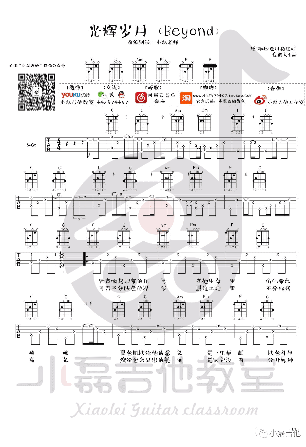 曲谱介绍: 光辉岁月吉他谱,Beyond的经典粤语歌曲,光辉岁月吉他六线谱 ,歌曲原调E,变调夹夹四品,选用C调指法。感谢小磊吉他教室出品,91吉他谱网站推荐收藏。随谱附上小磊老师为琴友们带来的《光辉岁月》吉他弹唱视频,大家参照演示练习。一首留存在数代人记忆中的金曲,歌声里总有一种雄浑激昂的力量,时刻的激励着人们,去创造属于自己的光辉岁月。