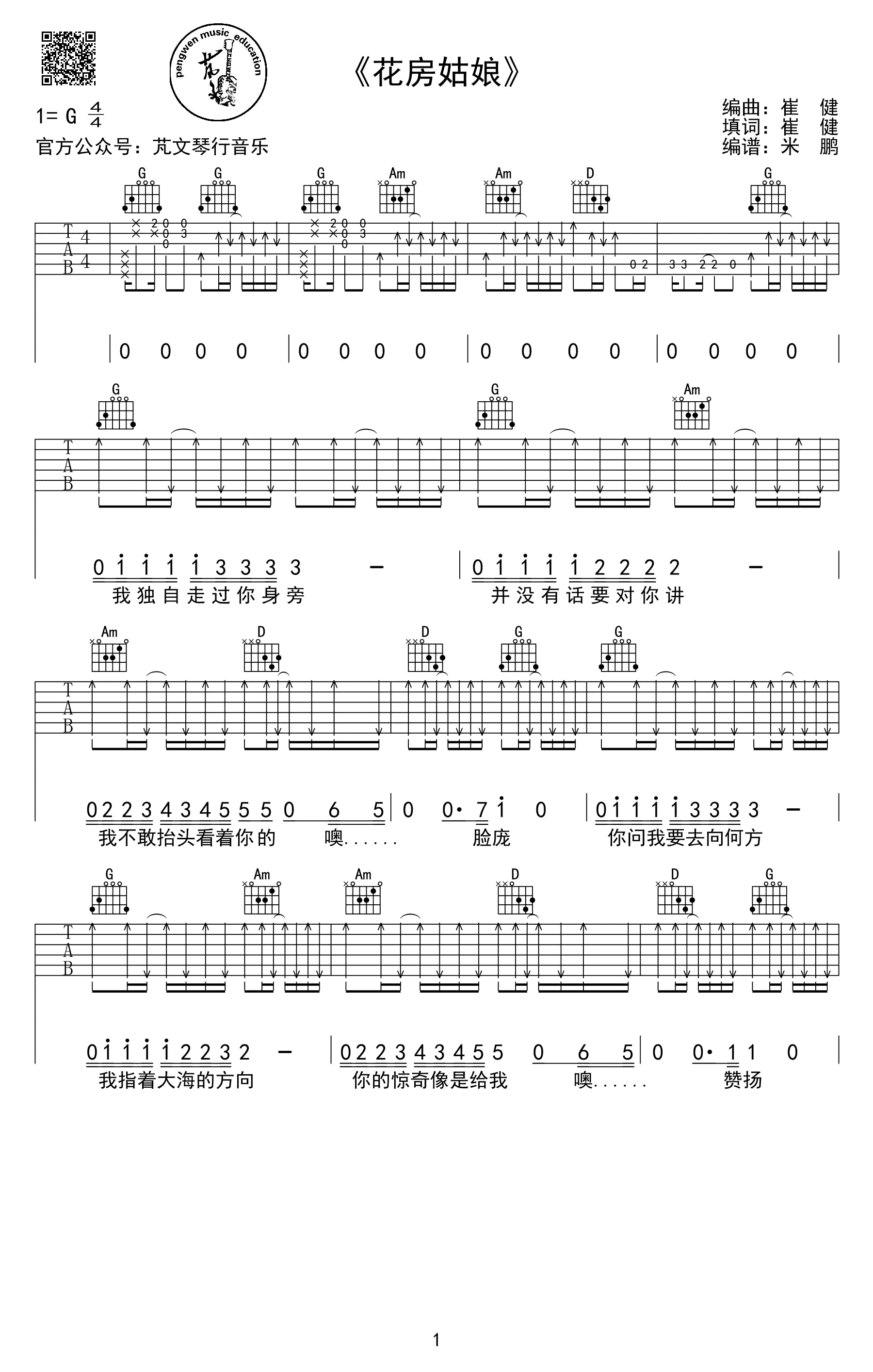 曲谱介绍: 花房姑娘吉他谱,G调指法编配,崔健的一首经典代表作品,《花房姑娘》吉他弹唱谱,高清图片六线谱,感谢芃文琴行音乐出品,91吉他谱网站收藏。 花房姑娘是崔健上个世纪八十年代末词曲创作演唱的,比起他那些声嘶力竭吼式的歌曲来,这首歌曲可以说是最抒情的一首,歌声中表达出的那份真挚而又强烈的情感,至今依然触动每颗青春跳动的心。