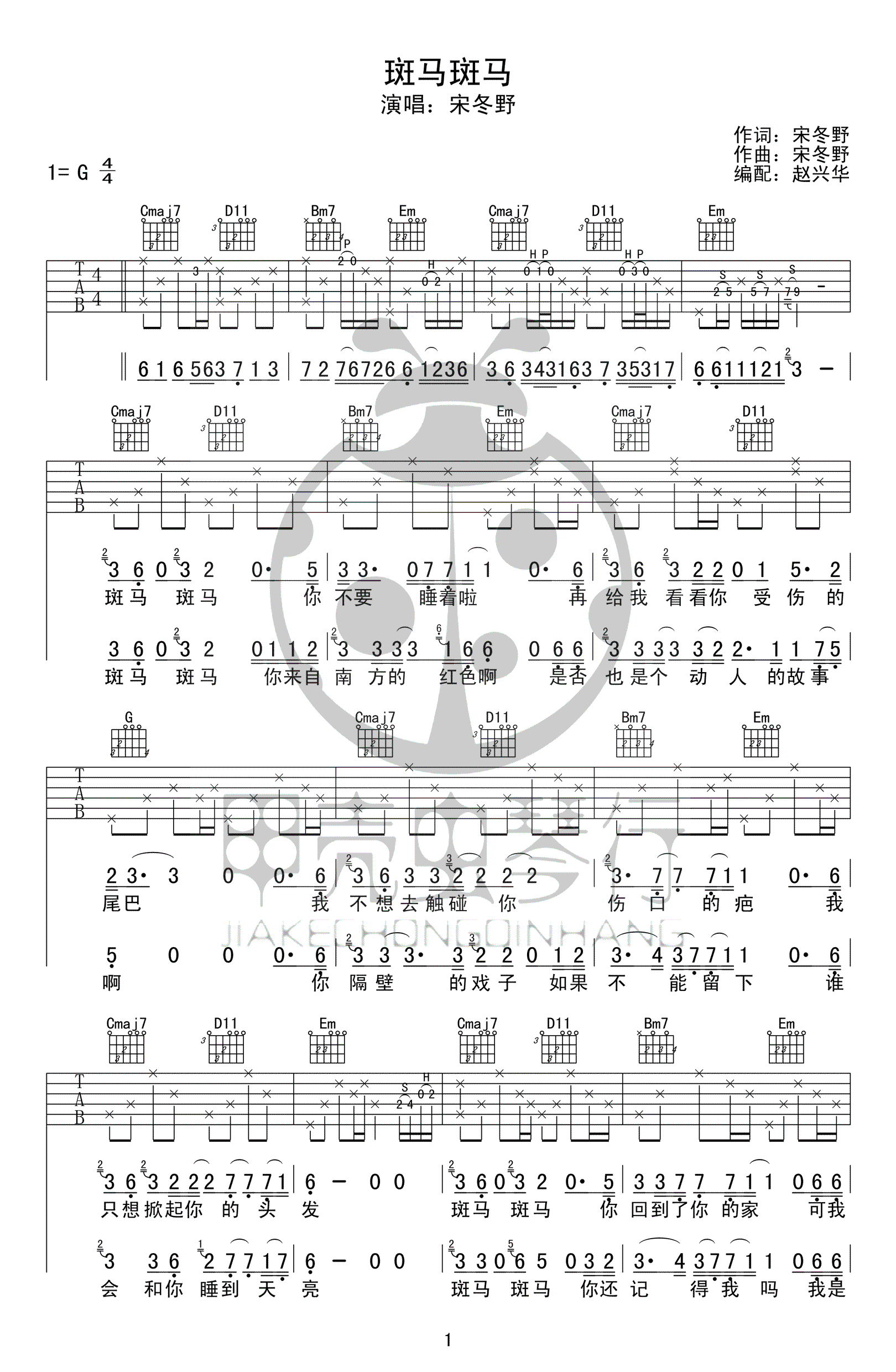 曲谱介绍: 斑马斑马吉他谱,宋冬野词曲演唱的一首代表民谣作品,斑马斑马吉他弹唱谱,G调指法原版编配,高清图片六线谱。感谢赵兴华编配,91吉他谱网站上传收藏。 斑马斑马,你会记得我吗?我是强说愁的孩子啊——宋冬野《斑马,斑马》。简单的旋律,平淡的歌词,唱出民谣般的温暖,道出平常生活中的情感。 ​