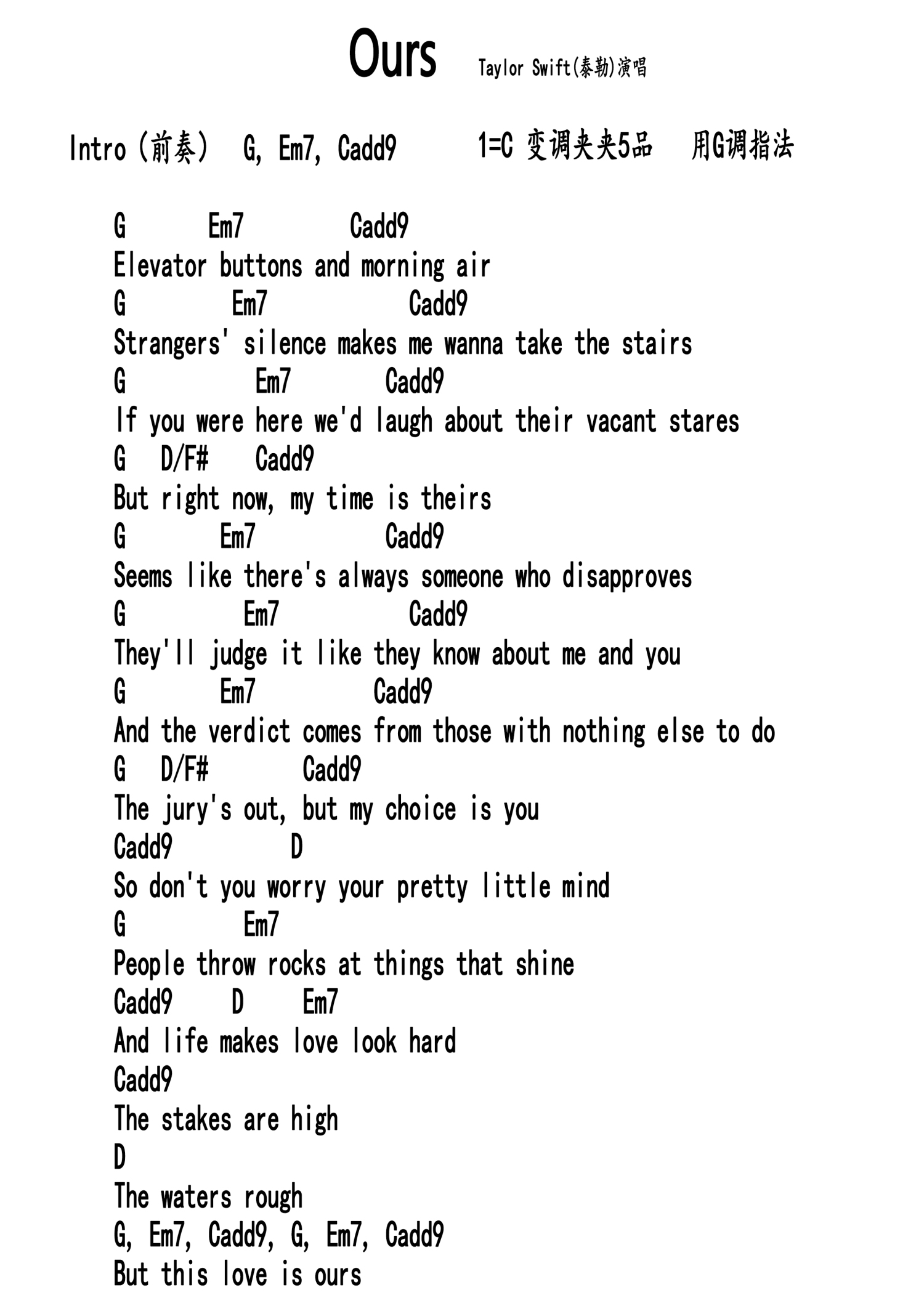 Ours吉他谱 - TaylorSwift(泰勒·斯威夫特) - G调吉他弹唱谱 - 和弦