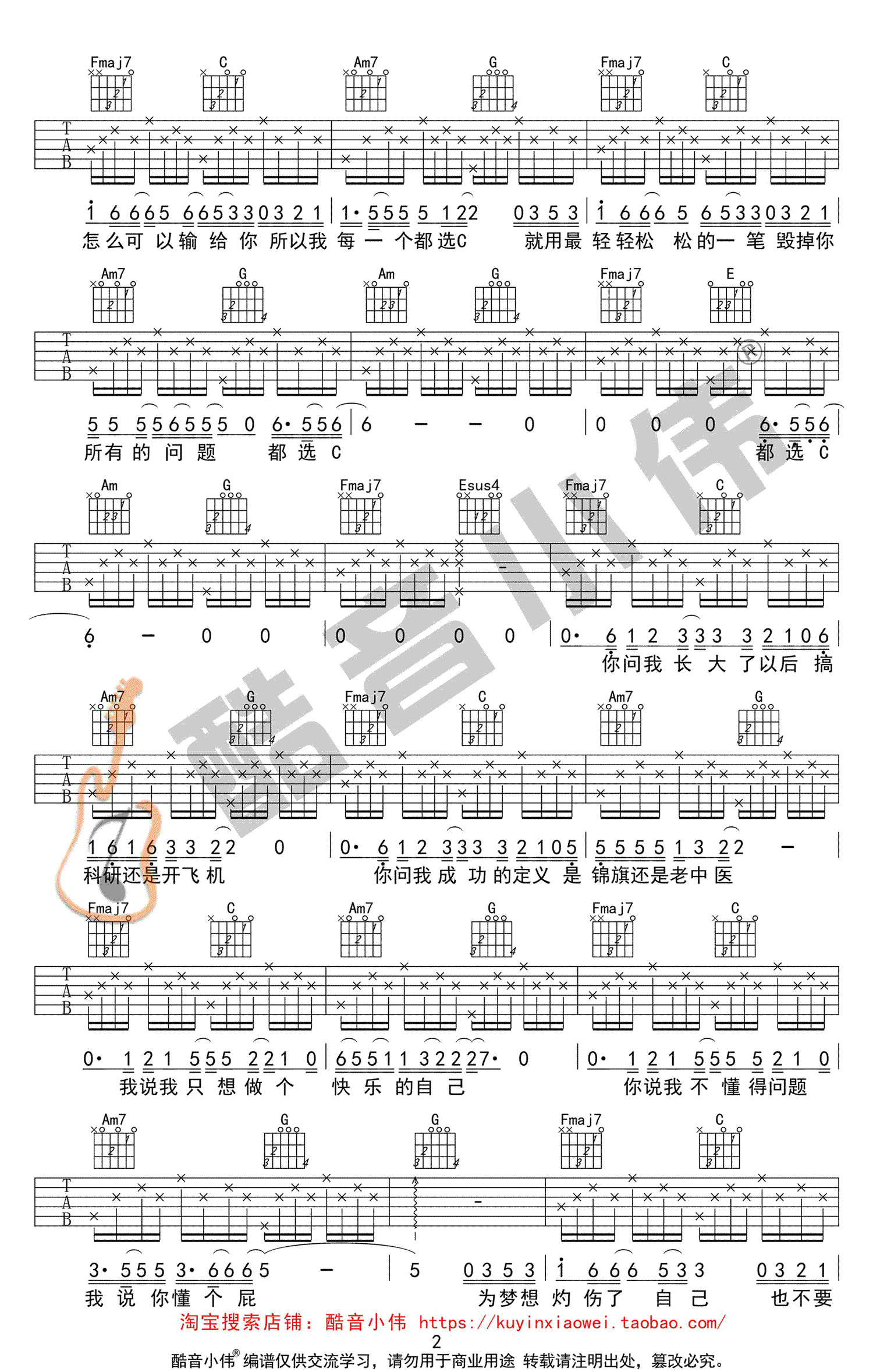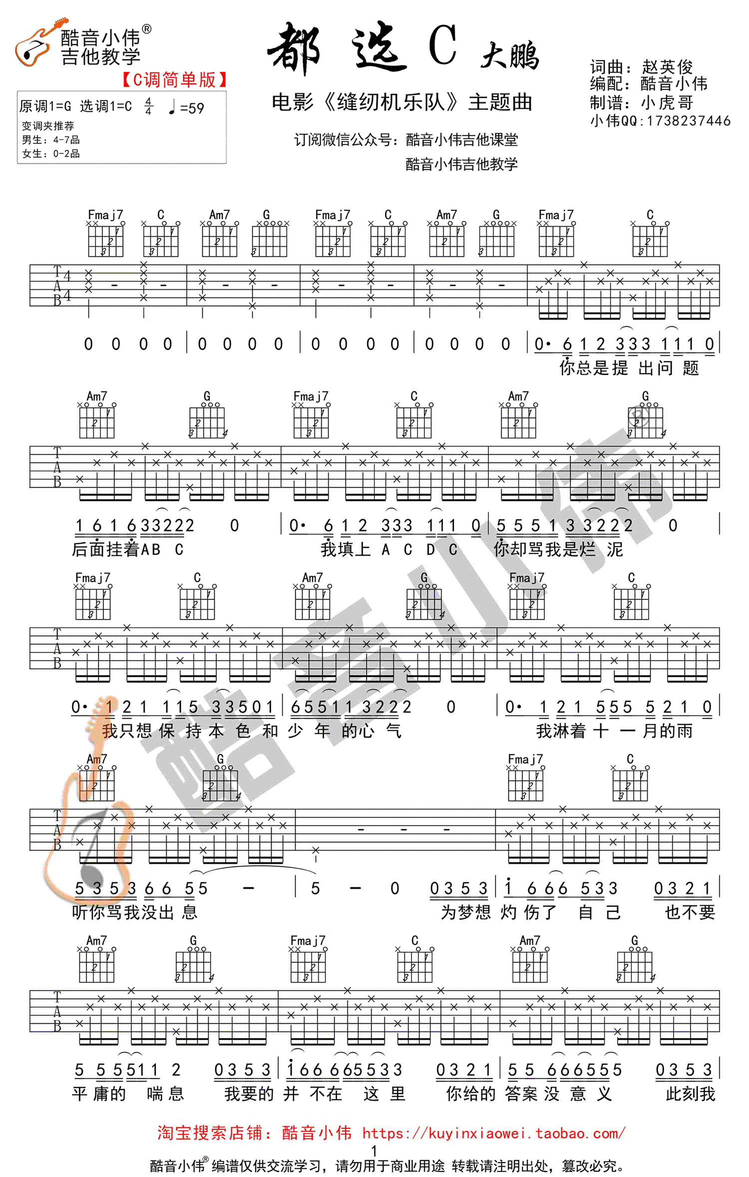 曲谱介绍: 都选C吉他谱,C调简单版,三张高清图片谱,大鹏电影《缝纫机乐队》宣传曲,都选C六线谱,原调G,变调夹推荐男生4-7品,女生0-2品。酷音小伟编配出品,91吉他谱网站上传收藏。 一首好听的励志歌曲,唱出为理想努力打拼和面对困难坚持不放弃的精神。喜欢用音乐为平凡的生活增添出有趣的色彩,愿每一个小人物都有自己的大梦想。