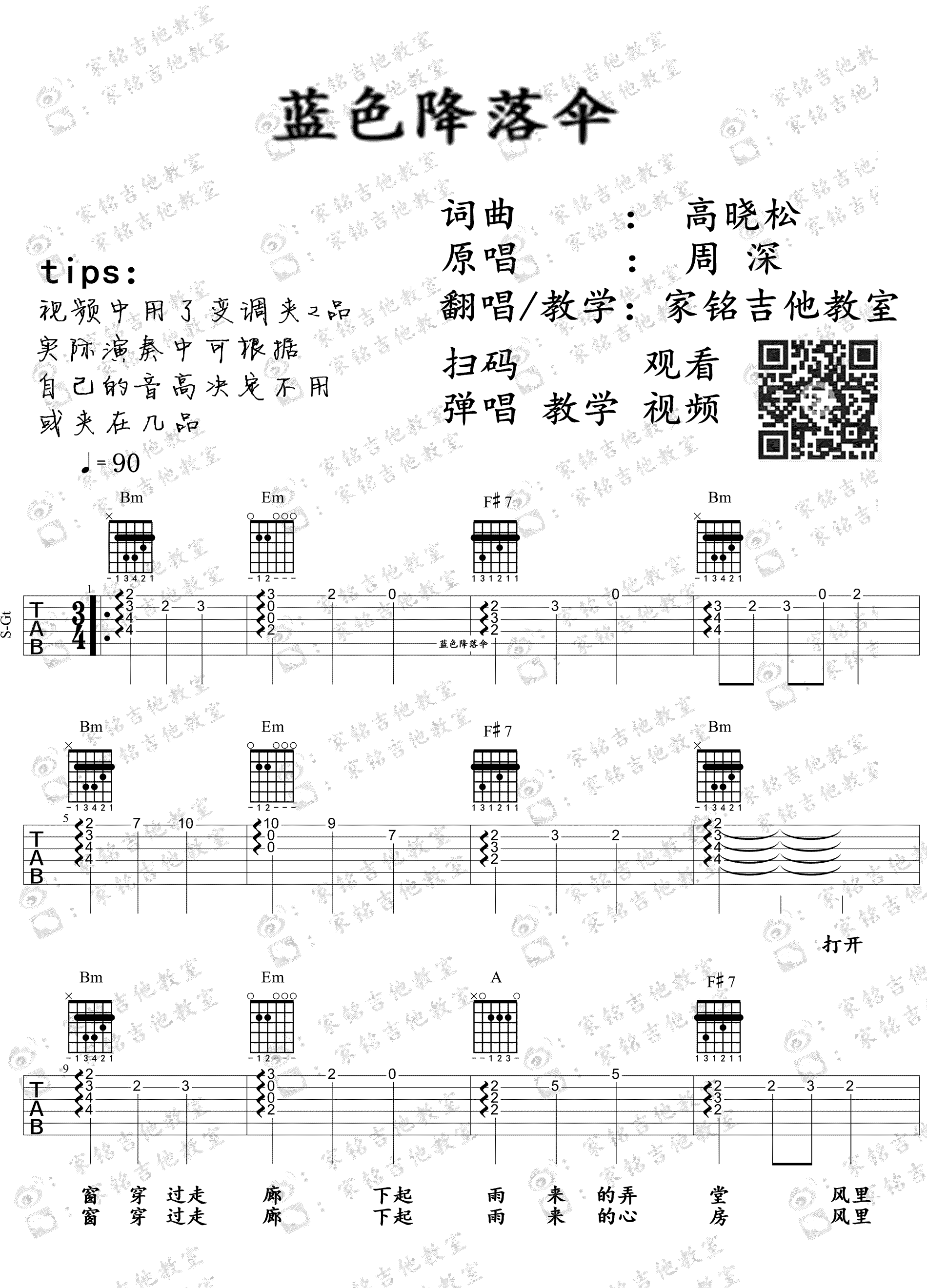 曲谱介绍: 蓝色降落伞吉他谱,周深演唱,一首轻柔又忧伤的歌曲,高晓松与尹约词曲合作,蓝色降落伞六线谱,感谢家铭吉他编配出品,随谱附上《蓝色降落伞》吉他弹唱视频,演示中变调夹夹第二品,琴友们可以根据自己的音域决定是否使用变调夹。这首歌曲节奏舒缓而悠扬,歌词诗意唯美,有着民谣的故事感和画面感,让听众瞬间沉浸在周深所呈现的情绪中,无法自拔。