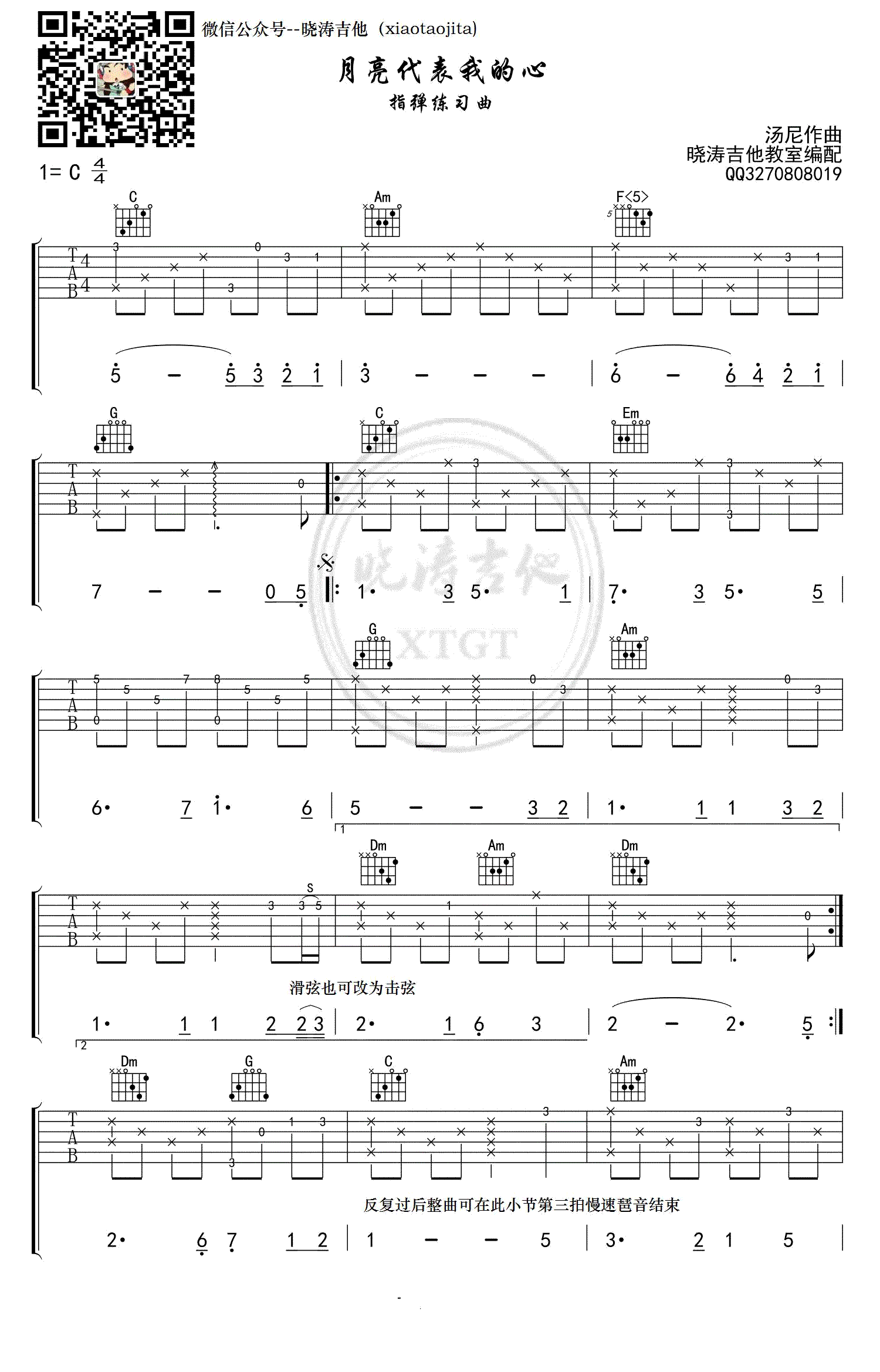 曲谱介绍: 月亮代表我的心吉他谱指弹版,C调指弹练习曲,根据邓丽君经典歌曲改编,一首旋律抒情动听温情婉转的吉他必弹曲目,月亮代表我的心吉他独奏谱,高清图片六线谱,晓涛老师编配并提供演奏视频,91吉他谱的琴友们可以练习起来。